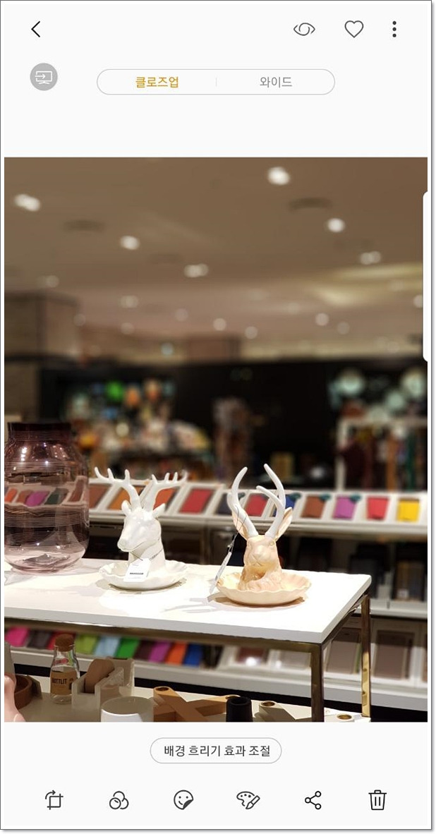 저장된 사진에서도 하단 [배경 흐리기 효과 조절]을 이용하여 배경 흐림 농도를 조절할 수 있다.