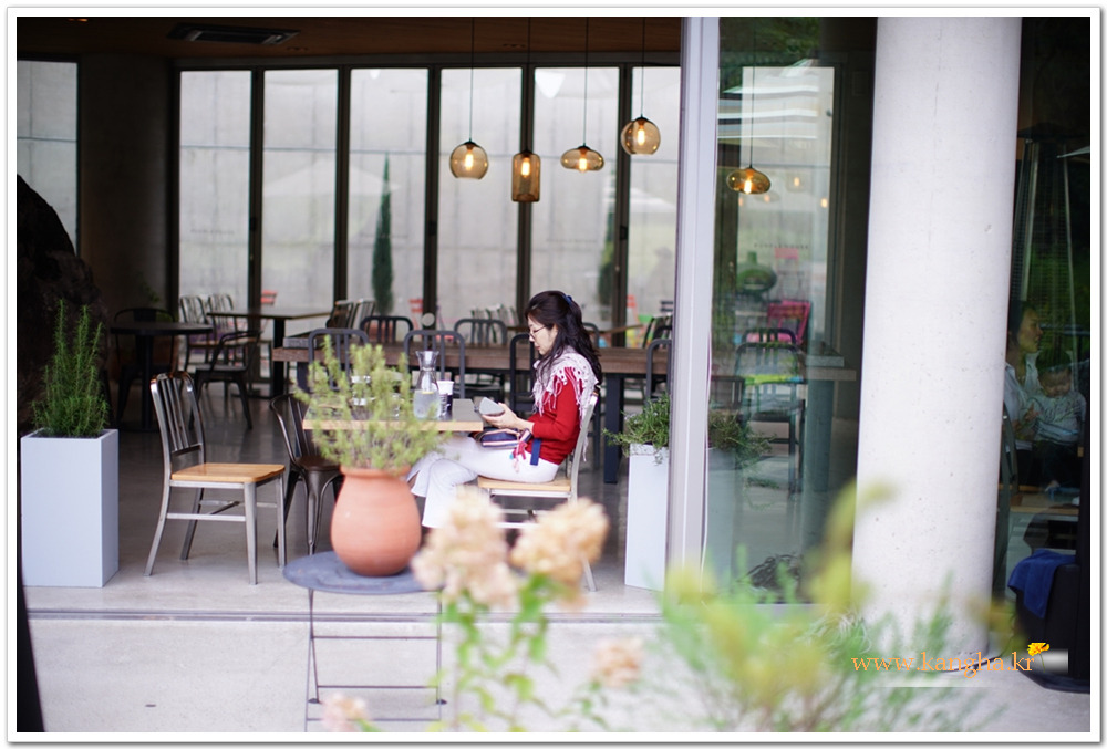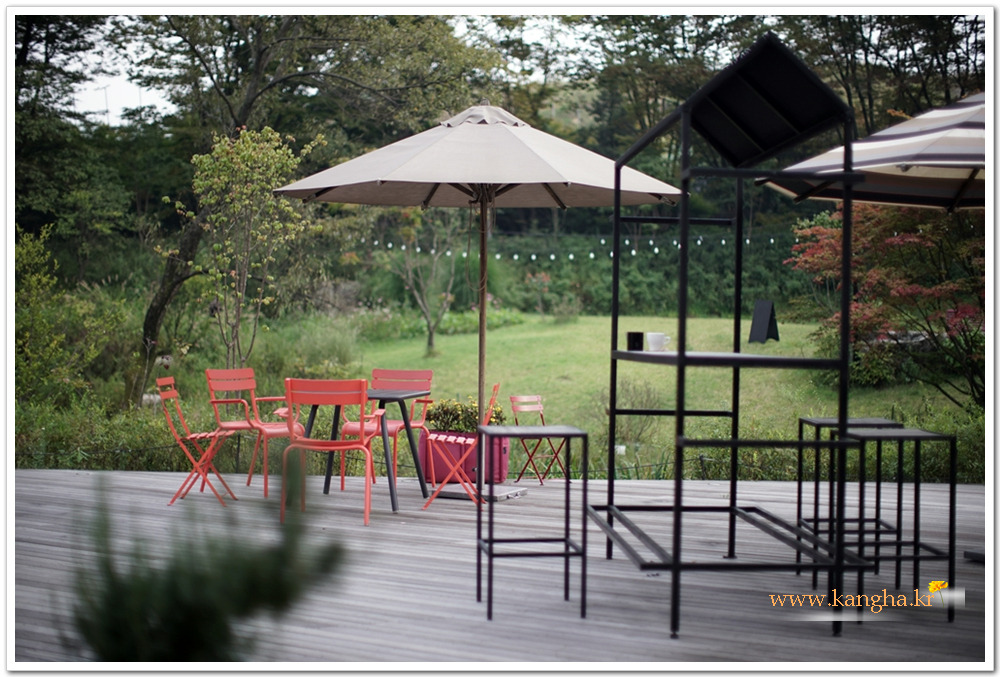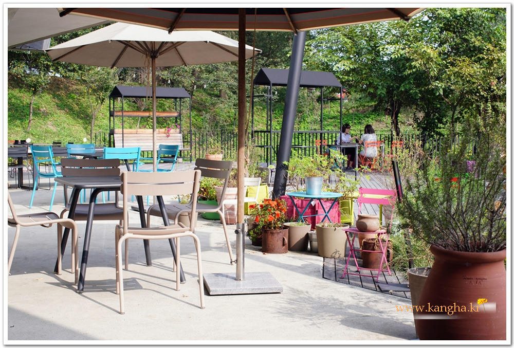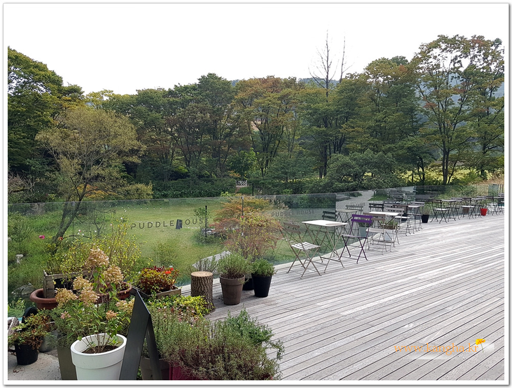 출입구 카페앞 데크. 데크에도 테이블이 많다.