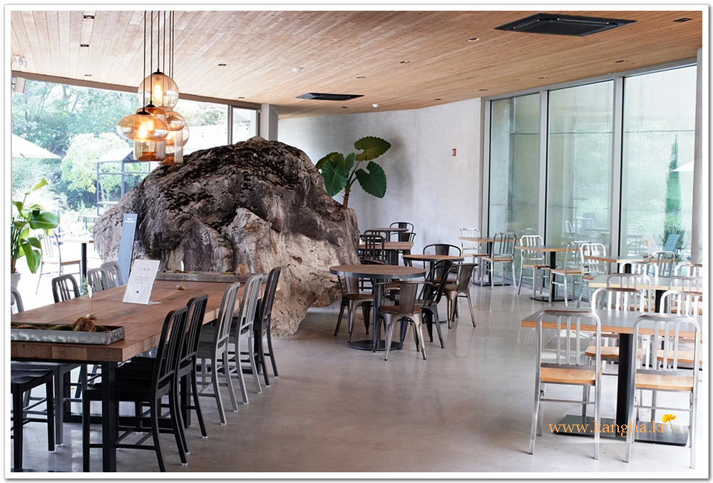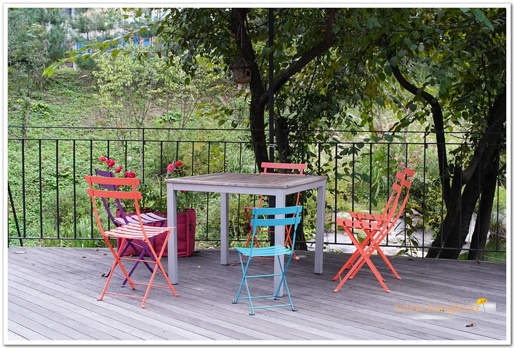아래 사진에서 보여지는 것과 같이, 다양한 형태의 테이블이 배치된 데크와, 야외 잔디로 이어지는 드넓은 외부가 무척 시원한 느낌을 준다.