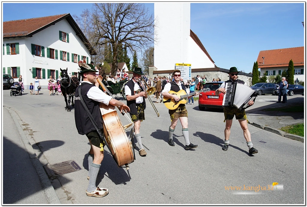 전통복장의 4인조 악단이 마차를 선도하며 동네 퍼레이드 출발~