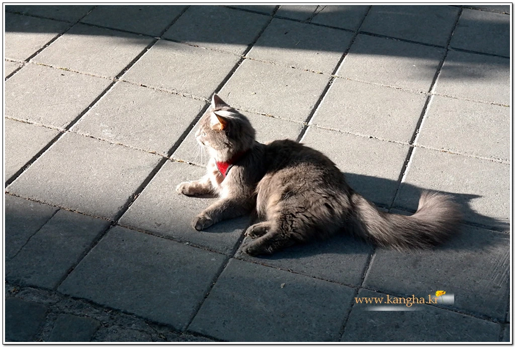 목에 치장된 장식을 보면 애초 길냥이는 아닌 듯한데, 남루한 모습으로 마치 디오게네스처럼 느긋하게 햇볕을 즐기고 있다.