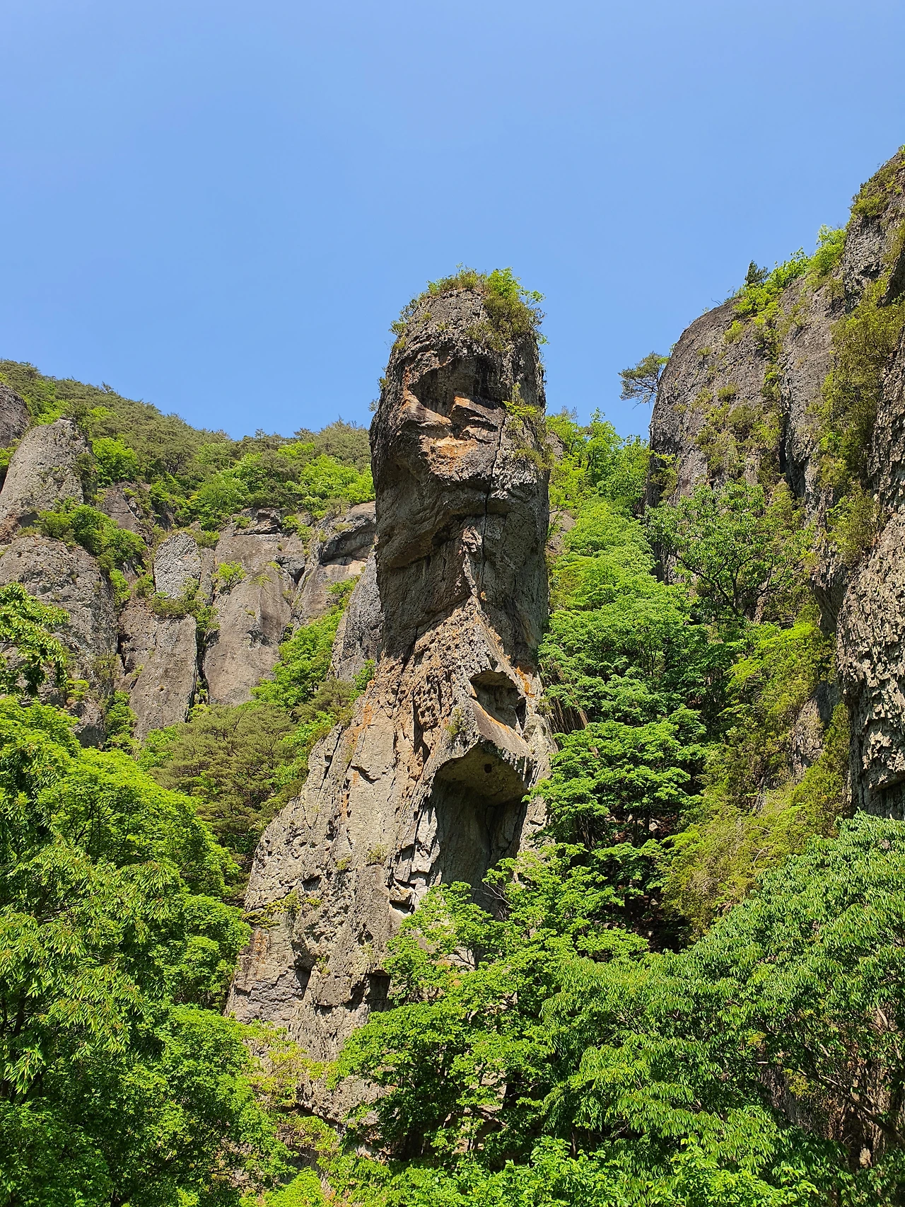 용추협곡을 통과하는 코스가 장관이고, 협곡을 감싸고 있는 기암과 주상절리가 트레킹의 즐거움을 가미시킨다.