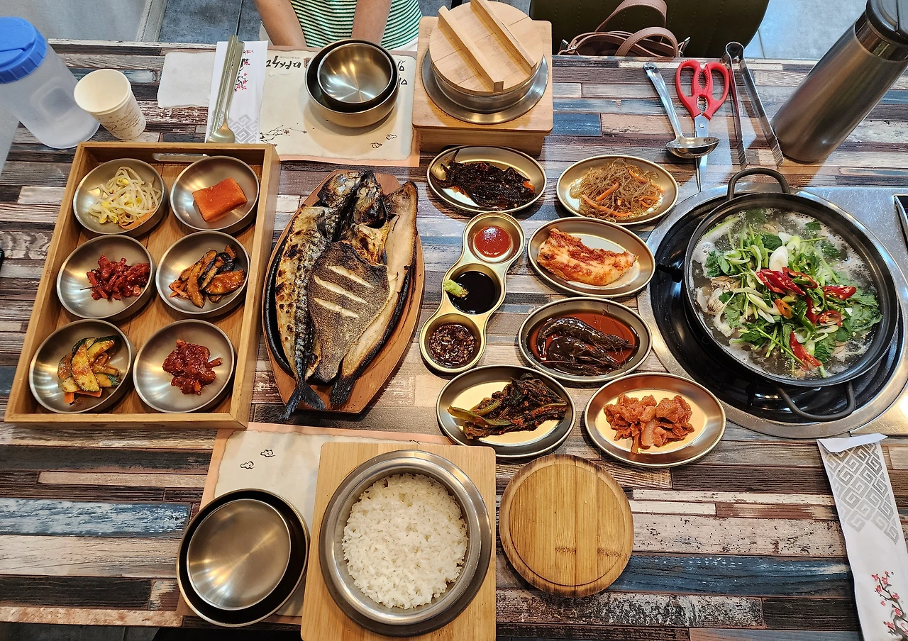 다양하면서도 정갈한 밑반찬에 화덕에 구운 세 종류 생선과 백합탕이 제공되는데, 칼칼한 맛의 백합탕에 엄지 척.