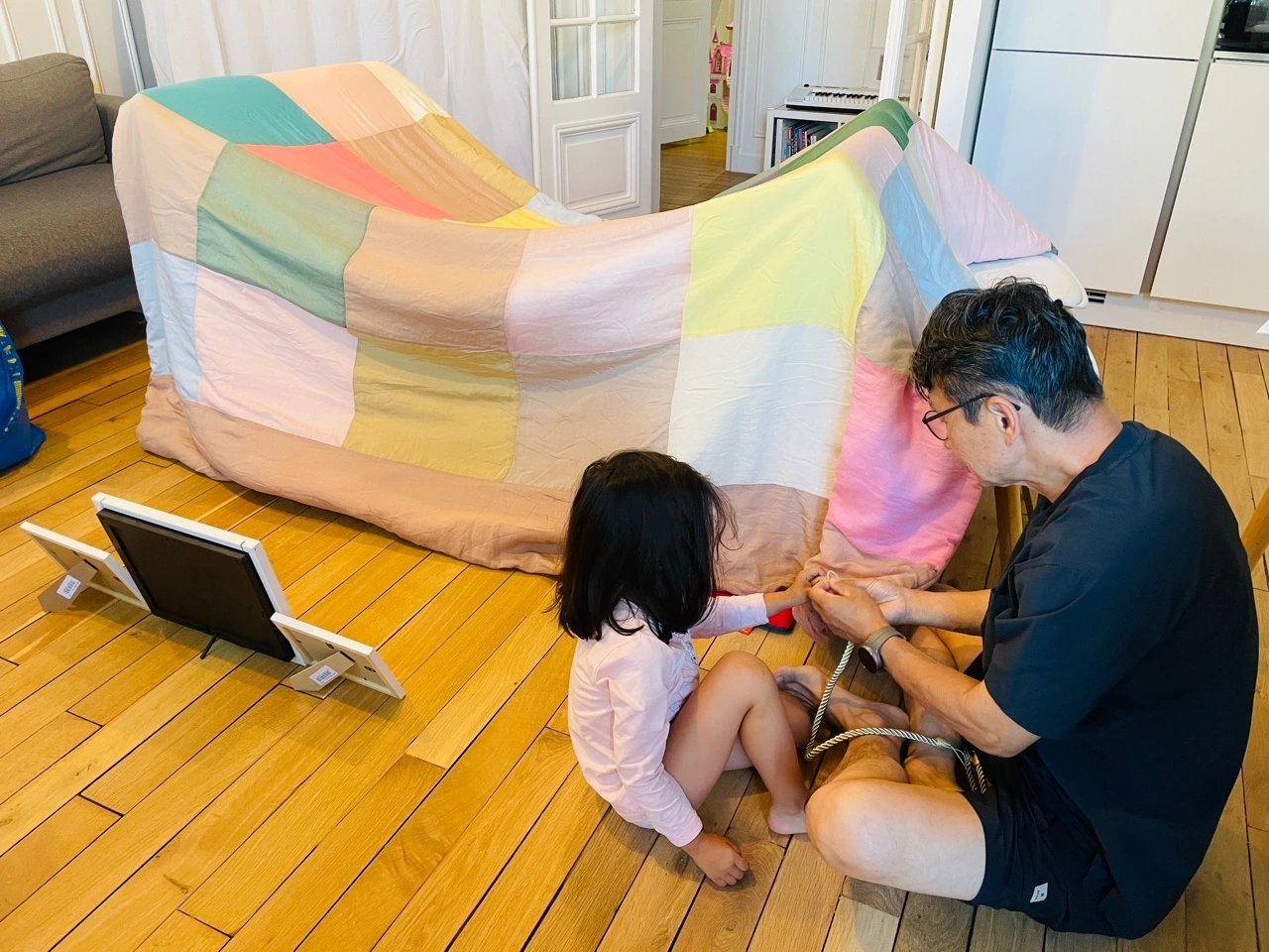 (언제 또 만날 지 모를) 할아버지와 함께 텐트를 만들었다는 기억을 남겨주기 위해 공동작업으로 완성된 텐트.