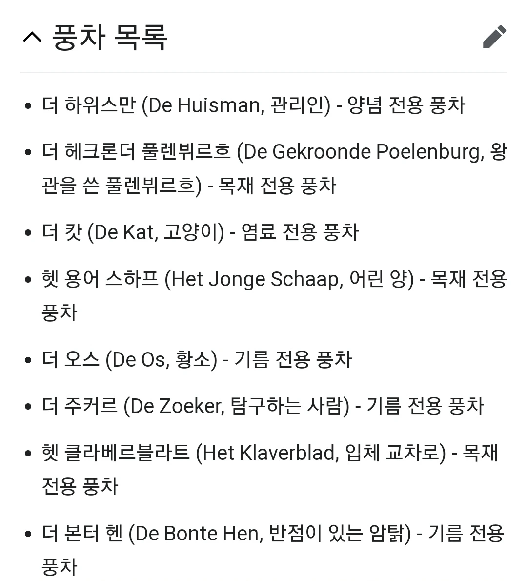 위에 분류된 풍차의 용도는 풍차 입구에 표기되어 있다.