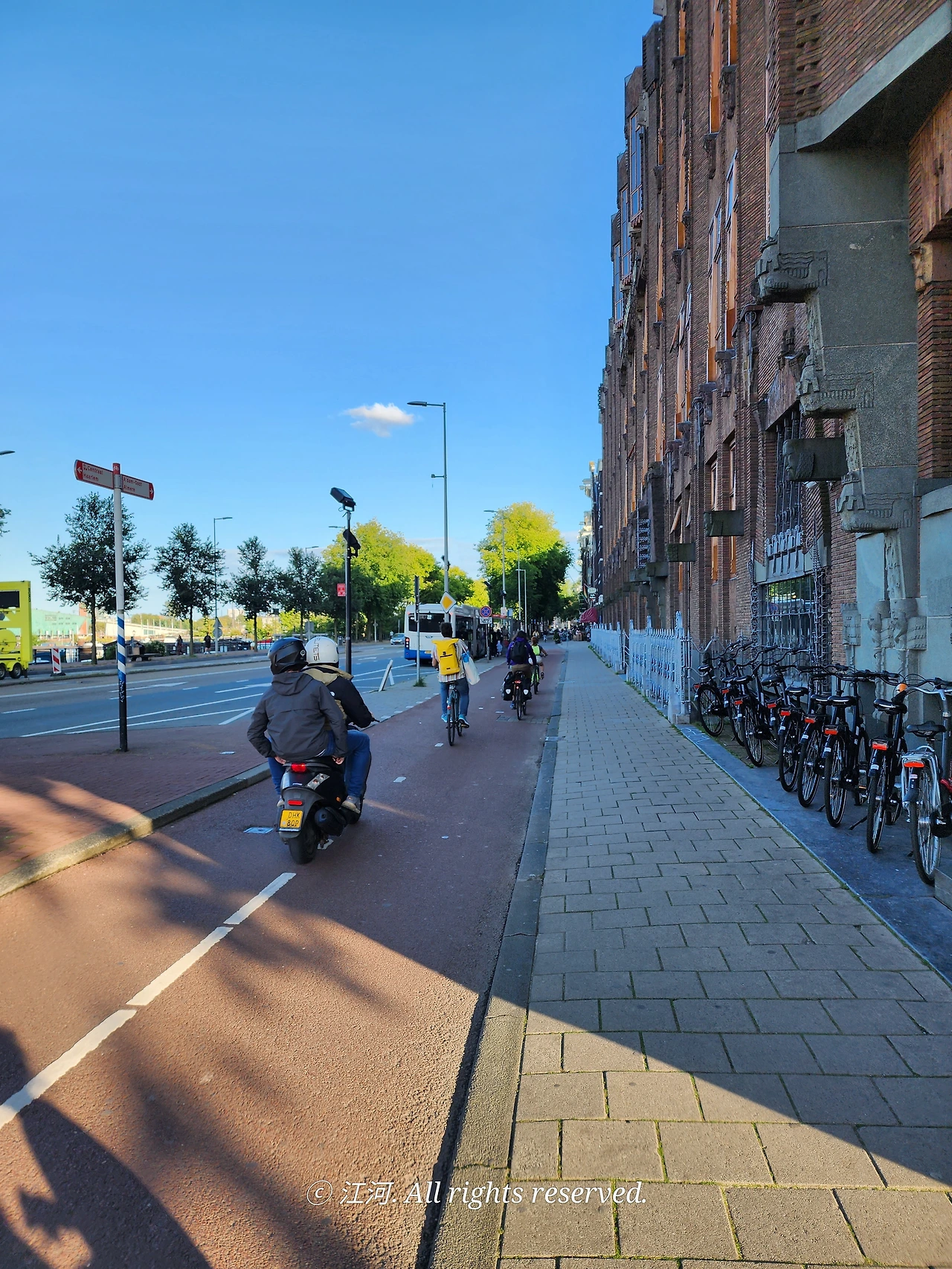 한국의 도심 자전거 전용도로는 대개 인도와 함께 있다. 차도와 단차가 둔 인도에 선을 긋고 색으로 구분하여 자전거 도로와 보도를 구분한다. 인도를 나누어 쓰다 보니 폭도 좁다. 자전거 도로라기 보다 다소 생색용인데 비해, 암스테르담은 인도와 확연하게 구분된 말 그대로 자전거 전용도로다.