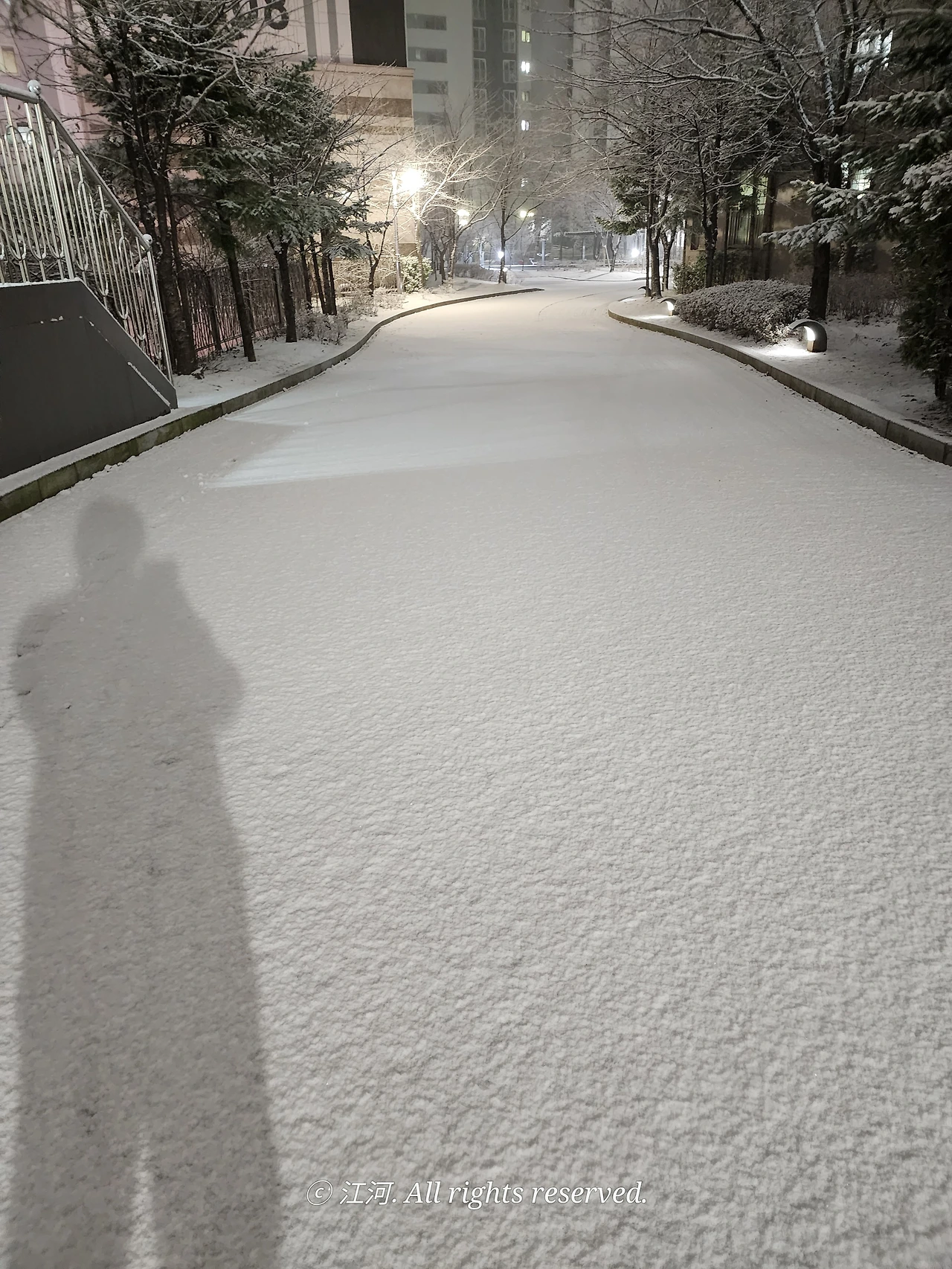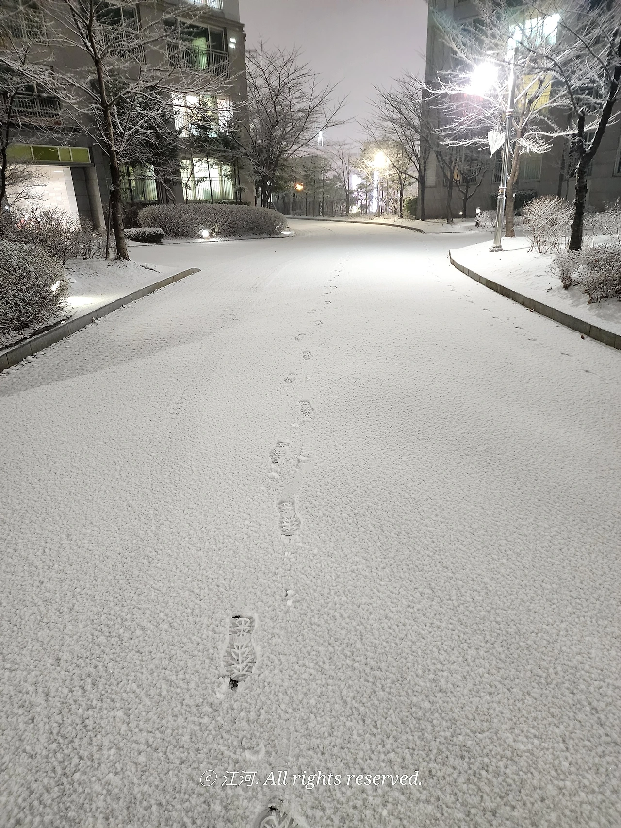 바퀴를 돌 때마다 계속 내리는 눈으로 인해 내 흔적이 소거되며 다시 순백에 첫 발자국을 내딛는 느낌에 걷는 즐거움이 더했다.