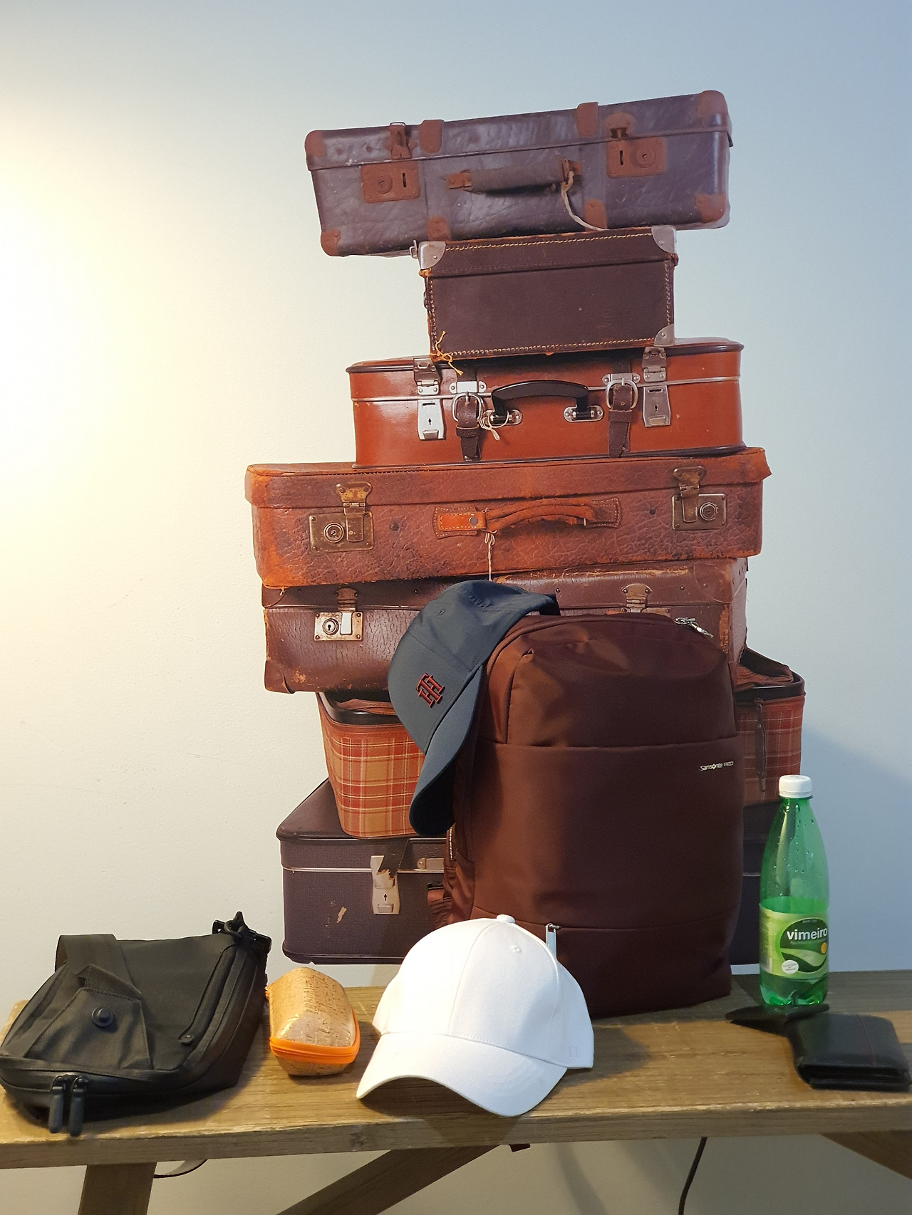 언뜻 보면 우리 짐으로 보이는 가로로 쌓여있는 빈티지 가방들은 벽지 사진. 벽지 사진과 긴 의자 높이를 절묘하게 맞춰 마치 실물인 듯 우리 배낭과 자연스럽게 매치되는 게 재밌다.