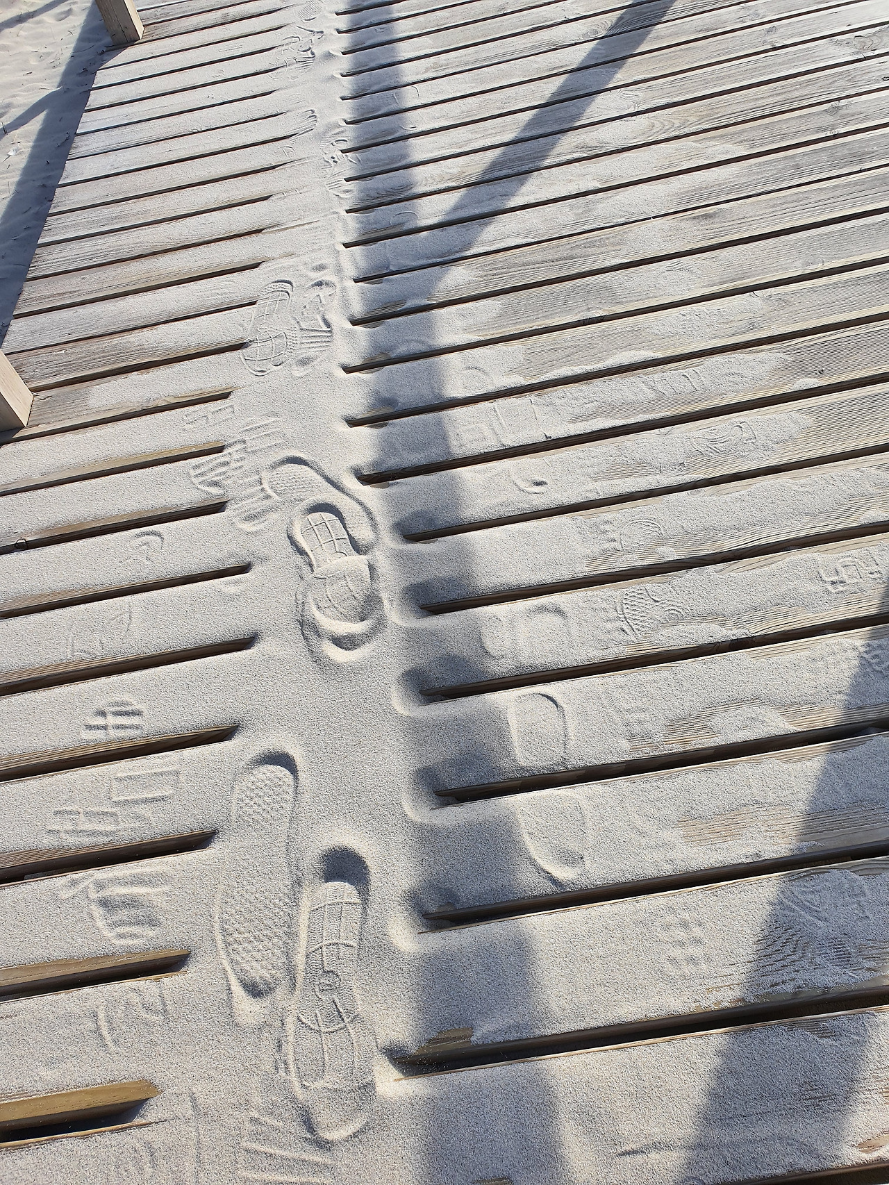 해풍이 옮겨 놓은 데크 위 모래에 우리의 방문 흔적이 남고, 뉘어 있는 풀에서 바람이 보이는 곳이 코스타 노바다.