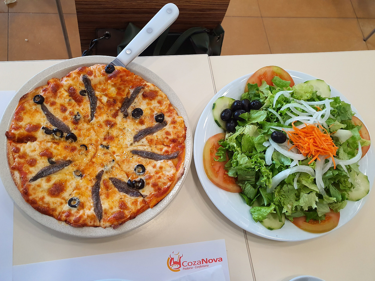 그래서 처음 해본 아침 외식. 태어나 피자로 아침을 먹기도 처음이다. 엔초비 피자.. 무지 짜다. 포르투갈 음식이 해물밥은 좀 낫긴 한데, 문어 요리를 제외하곤 전반적으로 우리 입맛에는 짜다. 매우 짜냐.. 덜 짜냐.. 먹을 정도냐.. 못 먹을 정도냐의 차이.