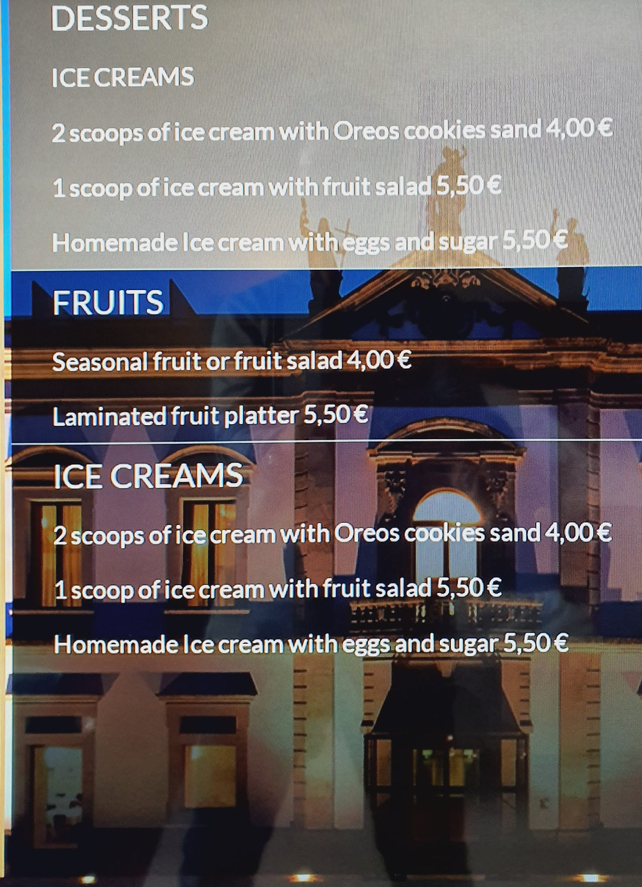 에피타이저에 메인요리를 가장 고가에 속하는 것으로 하고 디저트에 와인 한 잔까지 하니 투숙객 5% 할인 받아 두 사람 식대로 75유로가 채 안된다. 장기 여행자의 일상적인 두 사람 끼니로는 부담스러운 비용이지만, 이 정도 호텔 레스토랑 비용으로는 만족스럽다.