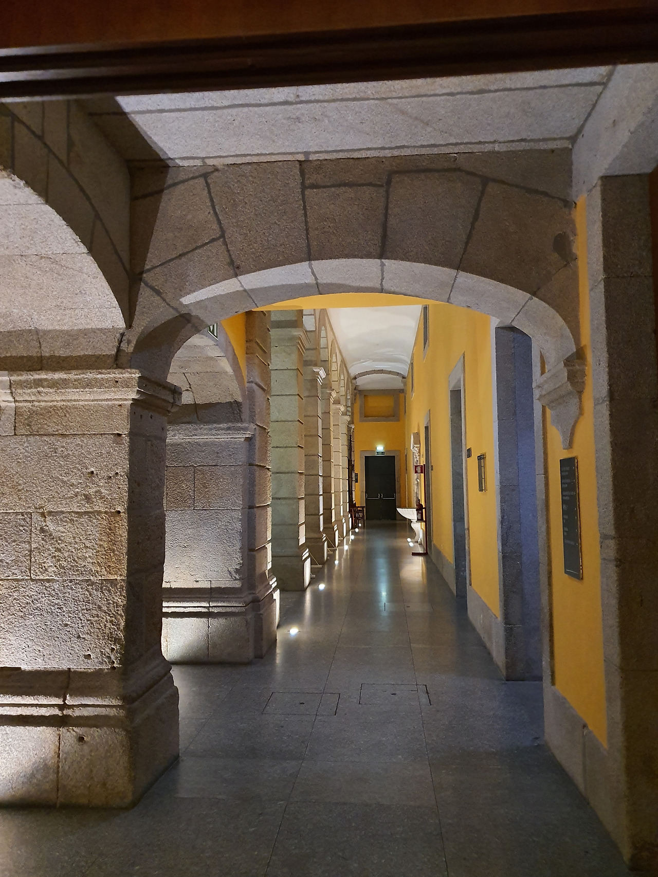 1층 복도의 돌 기둥이 수도원의 회랑과 같은 묵직한 중압감을 준다.