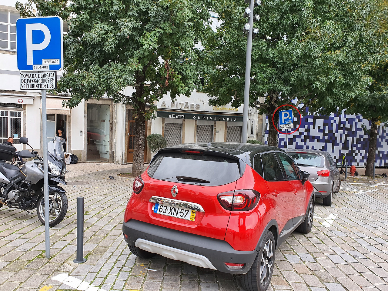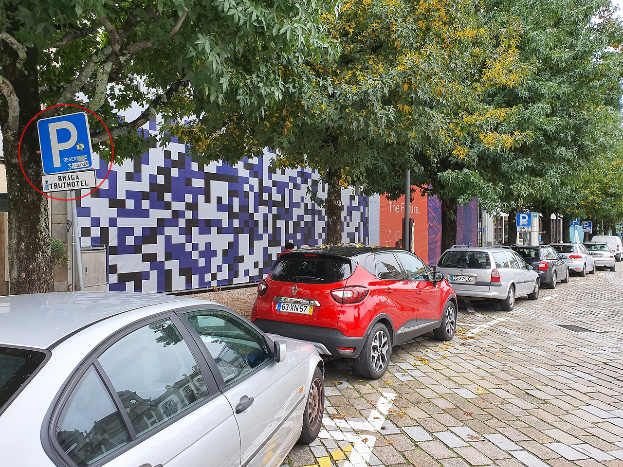 보행자 전용도로 입구 차도변 주차장를 살펴보니 주차표시 아래 단어들이 적혀있다. 그 중 우리 숙소명 Braga Truthotel도 보인다. 차량 진입이 안 되는 소규모 호텔들이 공용주차장을 임대해서 사용하는 거다.