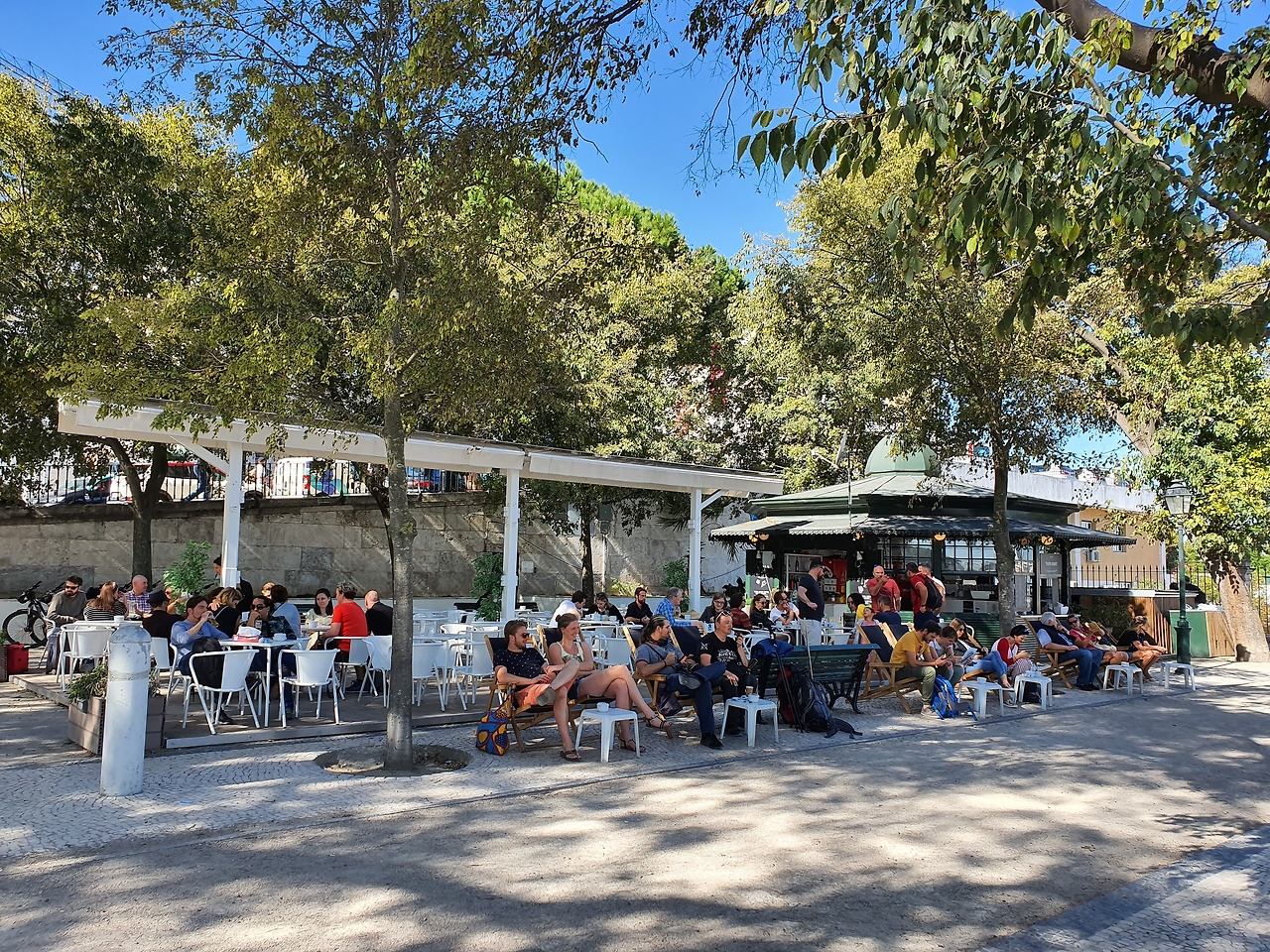 의 노천카페에서 리스본을 즐기는 여행객들.