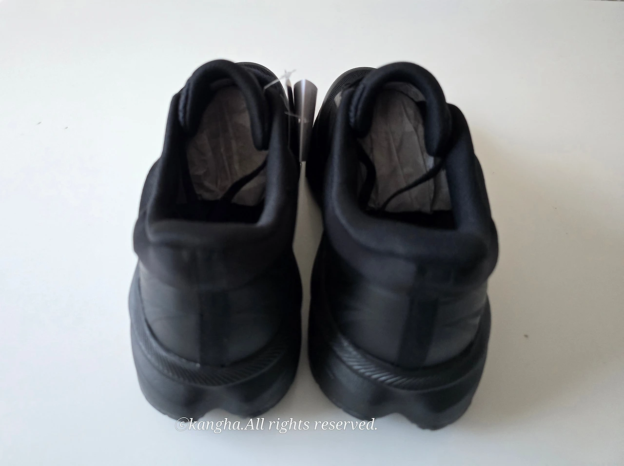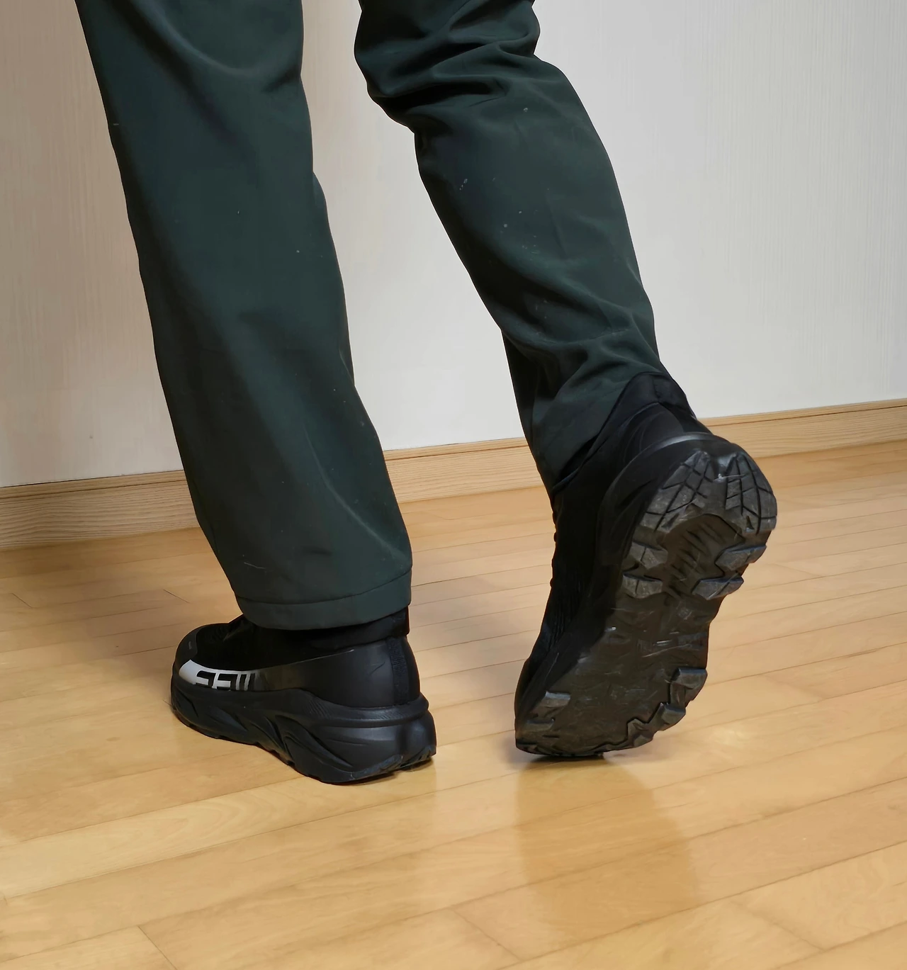 뒤꿈치 꼭지 부분을 높여 구둣주걱 없이도 손으로 잡고 신을 수 있다는 의미로 알았는데, 발목 고정을 위해 끈을 타이트하게 묶을 경우 그것만으로 쉽지는 않았다. 하지만, 몇 번 신으면서 발에 익숙해지니 곡선으로 되어 있는 뒤꿈치 꼭지 부분을 따라 발이 미끌어지듯 들어가는 게 점차 자연스러워 진다.