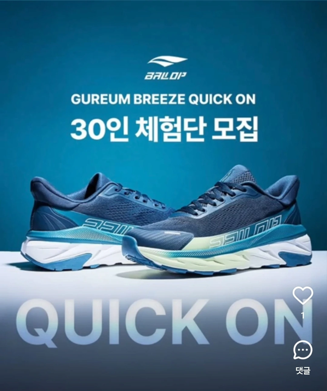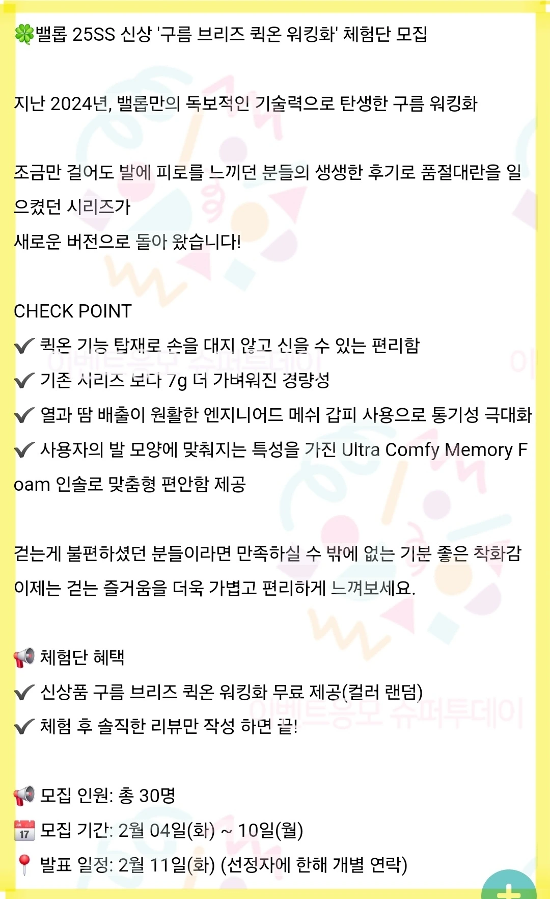 포털사이트 앱에서 밸롭 운동화 [티바트 프로텍트 1+1] 광고를 보고 사이즈 등 보다 구체적인 정보 검색을 위해 밸롭(BALLOP) 홈페이지를 방문했다가 우연히 보게 된 신상품 [구름 브리즈 퀵온 워킹화] 체험단 모집 공고.