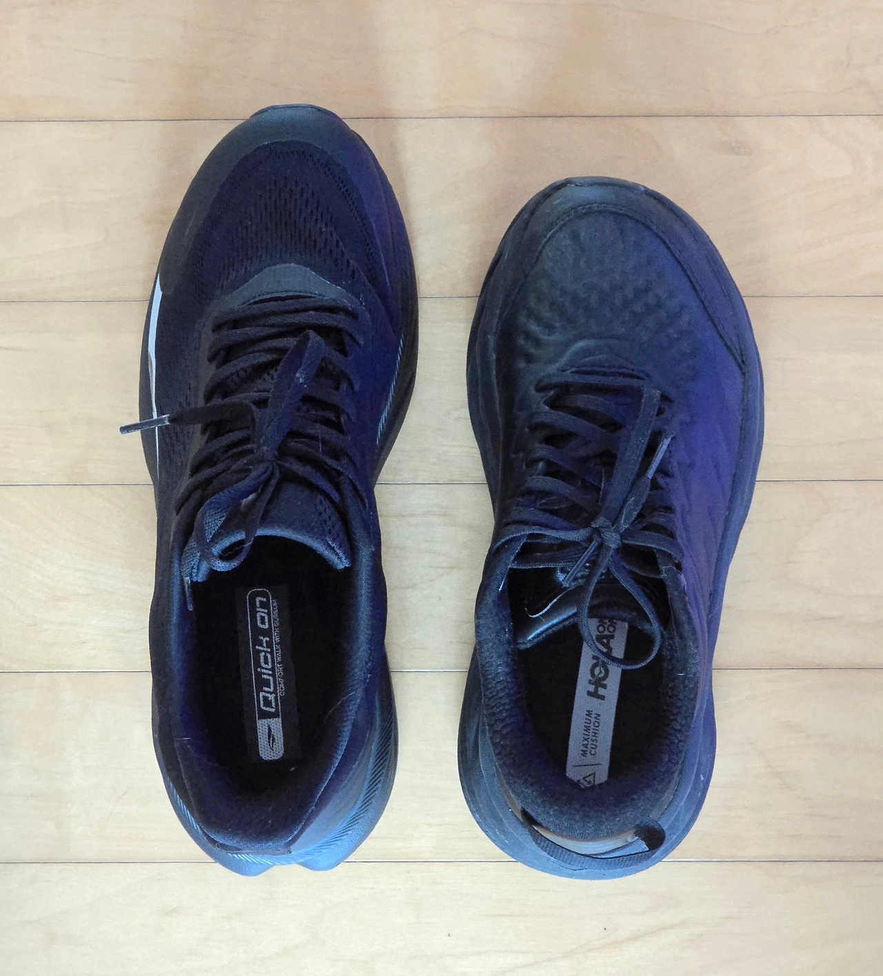 발볼이 작은 편인 옆지기의 HOKA 240mm와의 비교해 보니, 25mm가 더 길지만 폭이 훨씬 좁아 보인다.