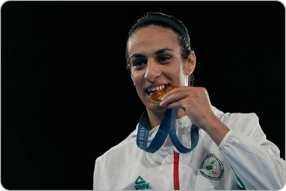 알제리 여자 복싱 선수 이마네 켈리프가 파리 올림픽 복싱에서 금메달을 목에 걸었다 (출처)