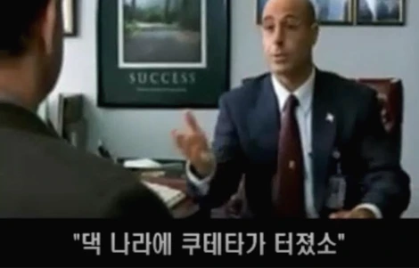 영어를 못 알아듣는 빅터가 당황하다가 문득 공항내 설치된 TV에서 고국의 내전상황 뉴스를 봅니다.