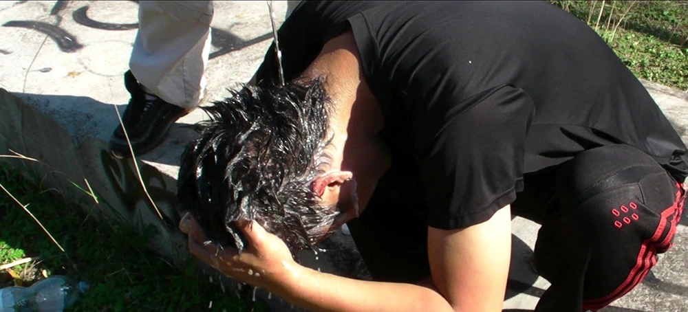 돌아갈 돈도 없지만, 이제 그들은 이야기하죠. 어떻게 해서든 집으로 돌아가는 것은 해보자, 라구요. 그때 폰이 울립니다. 유럽에 도착한 뒤에 인터넷 사이트에다 '홍보 영상 제작해요.'라고 올려두었던 글을 어느 호스텔에서 보고 제안이 온 것이죠. 순간 이 친구들이 한꺼번에 기쁨의 함성을 질러요. 관객도 그 순간 박수를 치겠죠? 그들은 마지막으로 사버렸던 그들의 마지막 생수로, 새로운 시작을 위한 세수를 하죠. 머리를 감습니다.