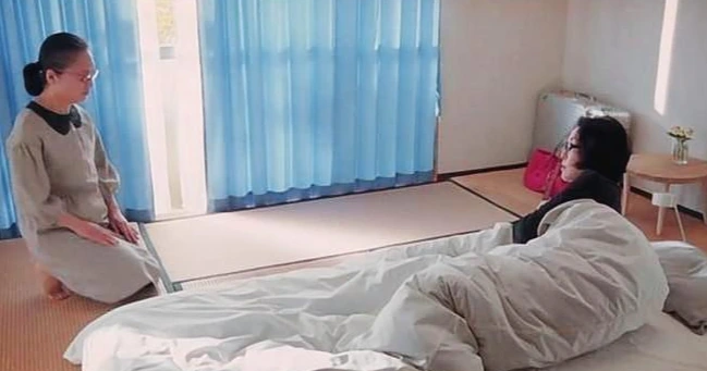 타에코도 이런 곳에 펜션이 있다는 사실에 놀라죠. 황당한 하루가 그렇게 저물고 잠이 듭니다. 다음 날 아침 눈을 뜨는데요. 아래쪽에 한 아주머니가 앉아서는 눈을 맞춥니다. 아침입니다,라고 하면서 강요는 아니지만, 이곳에서는 체조를 할 수 있어요, 하고는 나가죠.