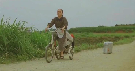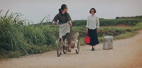 타에코가 난감해하고 있을 때, 저 멀리 하나의 점처럼 보이는 누군가가 조금씩 커집니다. 유유히 자전거를 타고 다가오는 중이죠. 바로 아침에 방에 앉아있던 아주머니인데요. 말없이 타에코 앞에 멈추더니 지그시 타에코를 바라보기만 하죠. 지친 타에코 눈에는 아주머니가 탄 자전거의 뒷좌석이 클로즈업되어 보입니다. 자전거의 뒷자리 하나가 비어있죠. 그러나 타에코는 커다란 캐리어를 가지고 있습니다. 자신과 캐리어 둘 중 하나는 자전거 뒷자리를 포기해야 하죠. 결국 타에코는 자신의 많은 것이 들어있는 무거운 짐 가방을, 위치도 모르는 그 들판에 버리고 자전거 뒷자리에 앉습니다.