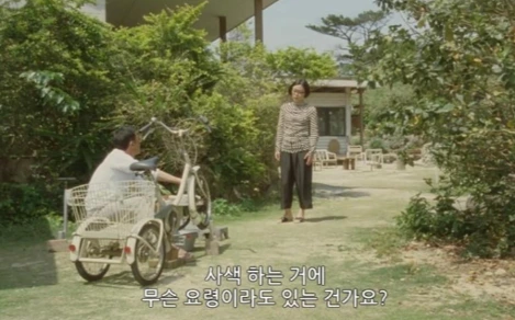 너무 조용하니까요. 파도소리, 팥빙수 얼음 가는 소리, 고기가 구워지는 소리 같은 평소에 전혀 무관심했던 소리에 귀를 기울이게 되죠. 특이한 장면이 나오는데요. 보통 우리가 길을 알려줄 때, 예를 들면 다음 사거리에서 우회전하세요, 라든지, 이대로 우편에 병원을 지나, 약국을 지나, 빵집이 나오거든, 빵집을 마주 보고 섰을 때 왼쪽 노란색 대문 집이 영희네 집이에요, 처럼 정확히 찾아갈 수 있도록, 이왕이면 명확한 명칭을 사용하게 되잖아요. 그런데 이 영화에서는 그렇게 말하지 않습니다.