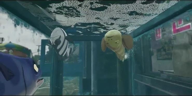 반드시 고민할 필요가 있다고 작품이 메시지를 주고 있어요. 수족관 안에는 앞에서 언급했듯 계급이 있습니다. 사실은 고등어 외에도 바다에서 온 물고기가 있긴 해요. 아주 아주 오래전 일이긴 하지만 수족관에서 가장 안전한 장소에 위치하고 있는 올드 넙치가 바로 바다 출신이에요. 올드 넙치는 이곳의 보스인데요, 자신이 바다에서 왔다는 이유로 최고의 자리에 앉게 된 것이에요.
