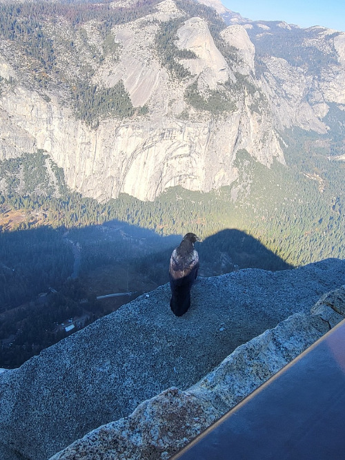 여기서 한 시간 정도 운전을 하면 Glacier point에 다다른다. 여기서는 하프돔과 그 주변의 산봉우리들을 내려다볼 수 있는 곳이다. 까마귀 한 마리가 우리가 같이 View를 즐기고 있다.