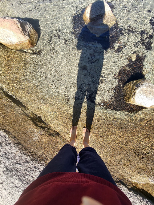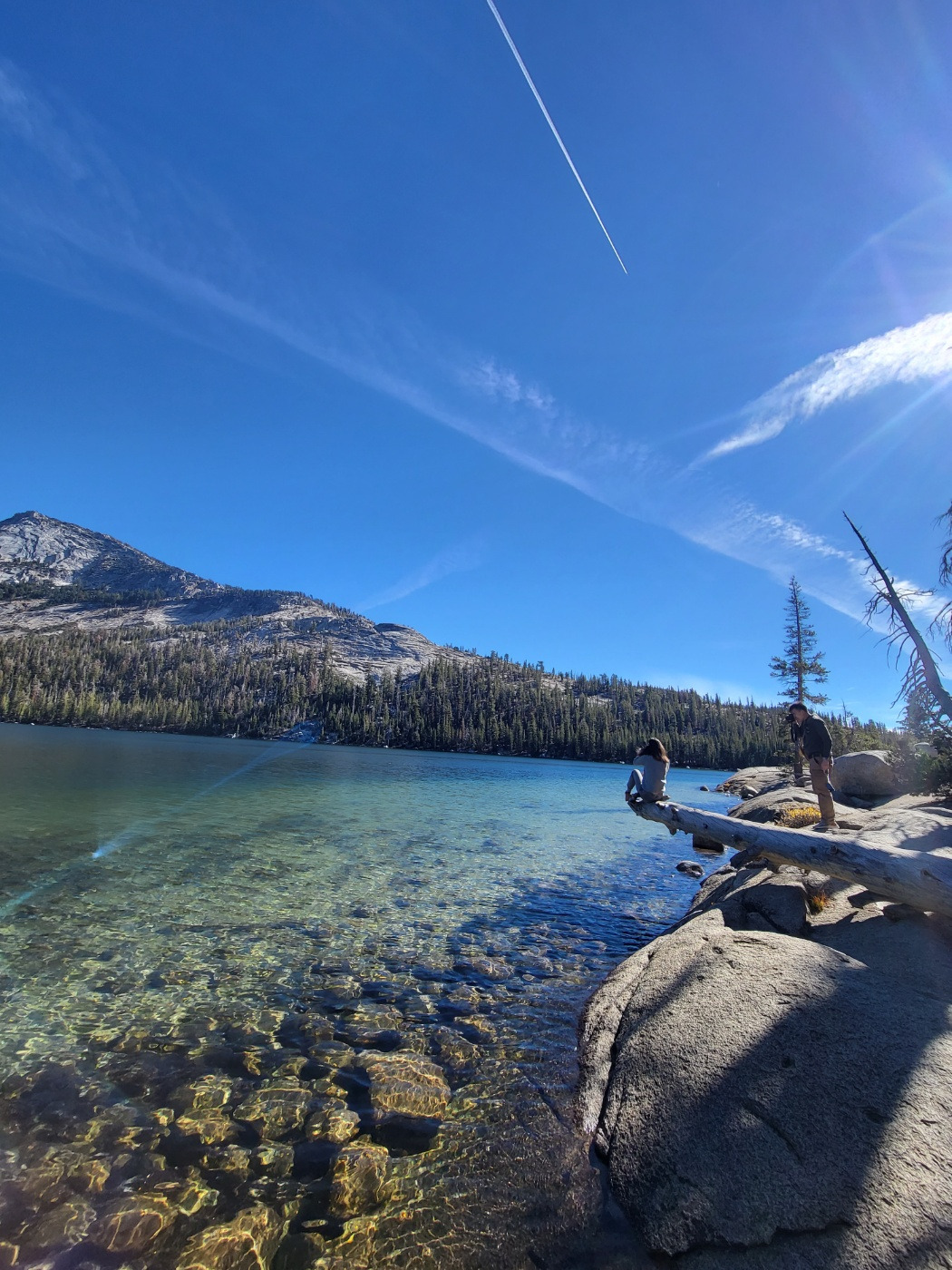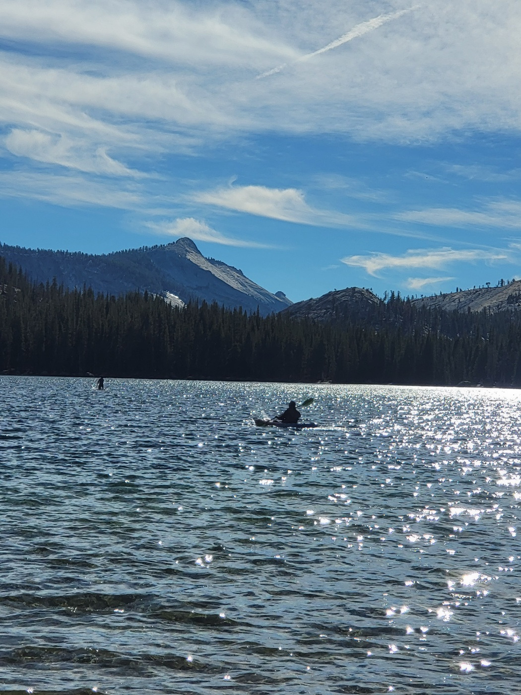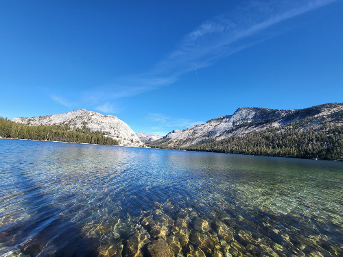 이 포인트에서 조금만 가면 요세미티의 대표적 호수 Tenaya 호수가 나온다. 여름보다 물이 줄어들었지만 그래도 할 수 있는 건 다할 수 있는 곳이다. 수변 따라 걷기도 하고, 그냥 멍하니 경치를 응시하기도 하고 카약도, 보드도 탈 수 있다. 워낙 고지대에 있다 보니 호수가 바위에 둘러싸여 있는 것도 흥미롭다. 발을 담가보니 꽤 차다. 여행의 피로감이 싹 가신다. 사진을 찍어보니 호수바닥에 비친 내 그림자에 내 발이 겹쳐 약간 혼돈스러운 사진이 나와 깔깔거리며 웃는다. 준비해 간 점심을 여기서 먹으며 신선 모드로 두 시간 지루하게 않게 보냈다.