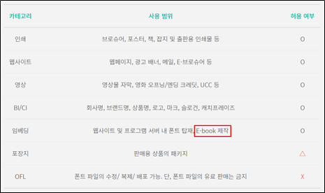 가독성 높은 폰트 구성은 필수다. 우리는 전자책을 유료로 판매하기 때문에 예쁜 폰트라고 무조건 사용하는 것이 아니라 상업용으로 활용해도 문제없는 무료 폰트를 사용해야 한다.