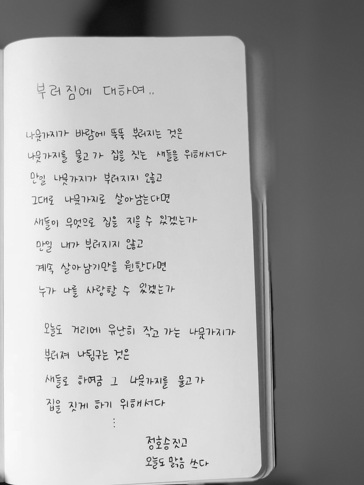 다음 손글씨는 나희덕 <못위의 잠>으로 하겠습니다.