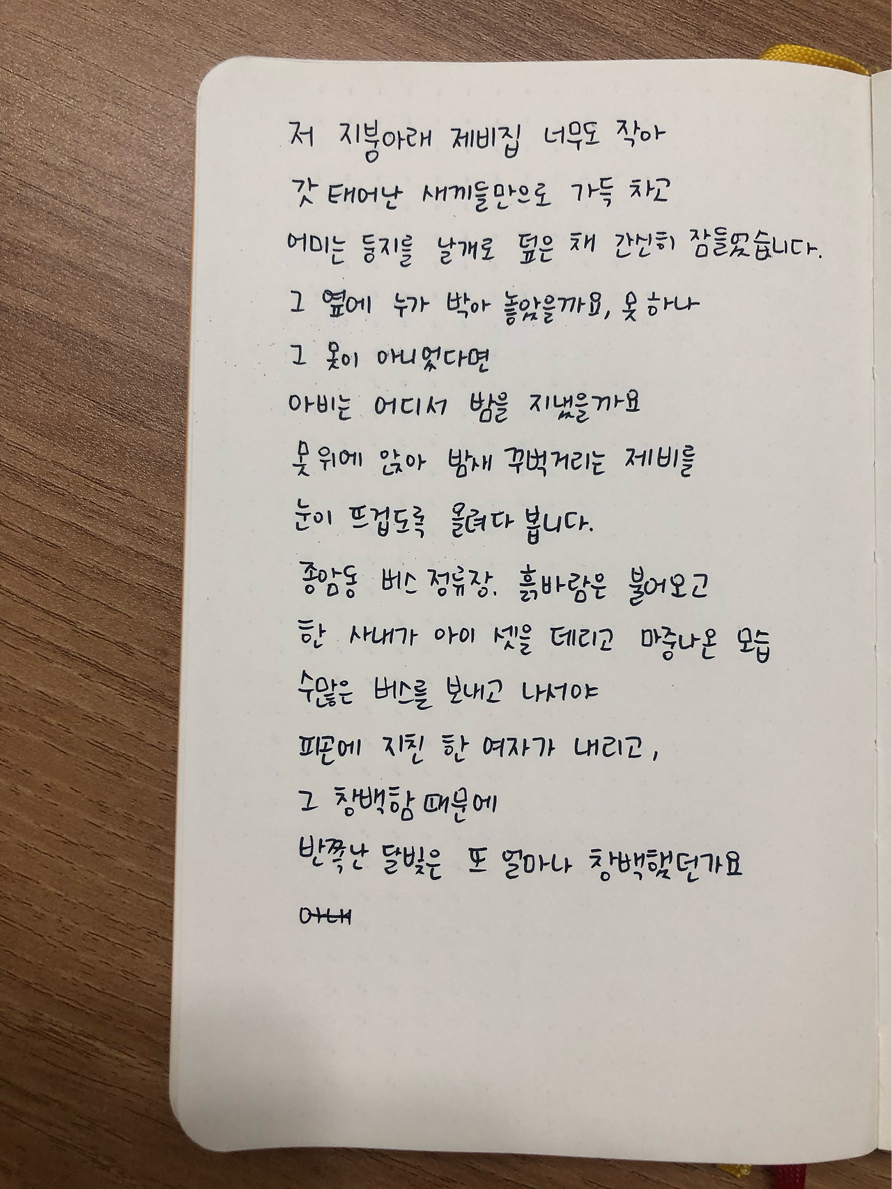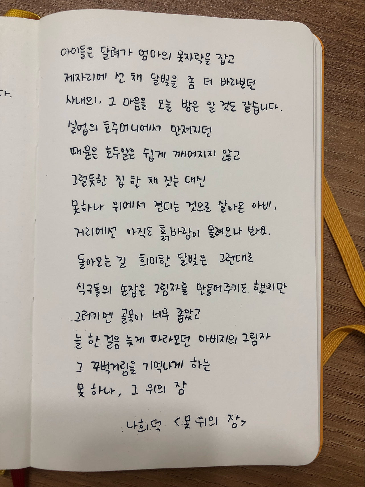 내가 제일 좋아하는 시는 윤동주의 <서시>지만, 가장 많이 울렸던 시는 나희덕의 <못위의 잠>이다. 지금 보고있는 미드의 변호사들처럼 화려하고 번지르르하지 않아도, 아버지라는 자리에서 가장 좋은 것을 주려고, 그 없는 것도 내놓으려는 아빠의 사랑이, 마음이 저리도록 훌륭하고 너무나 아름다워서, 볼 때마다 눈물이 난다. 오늘 만난 아저씨의 따님도, 그 사랑을 담뿍 느끼고 행복하시길 기도해본다.
