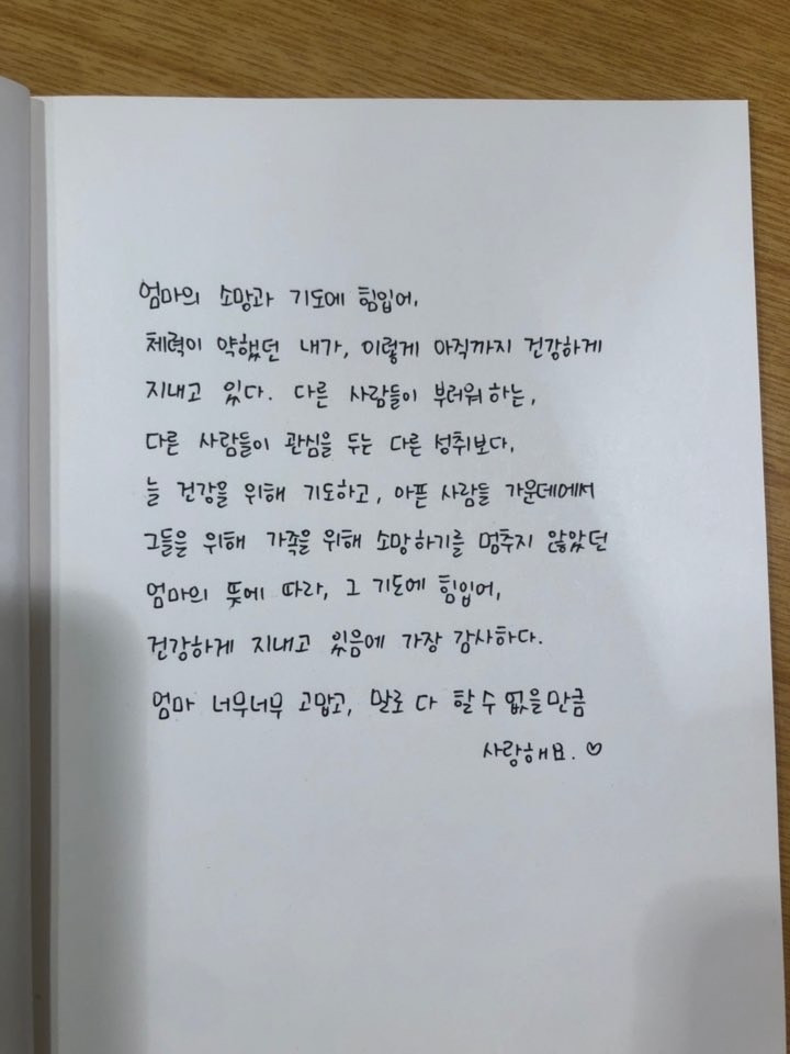엄마의 소망과 기도에 힘입어 체력이 약했던 내가 이렇게 아직까지 건강하게 지내고 있다. 다른 사람들이 부러워하는, 세상이 관심을 두는 다른 성취보다, 늘 건강을 위해 기도하고, 아픈 사람들 가운데에서 그들을 위해 가족을 위해 소망하기를 멈추지 않았던 엄마의 뜻에 따라, 그 기도에 힘입어 건강하게 지내고 있음이 가장 감사하다.