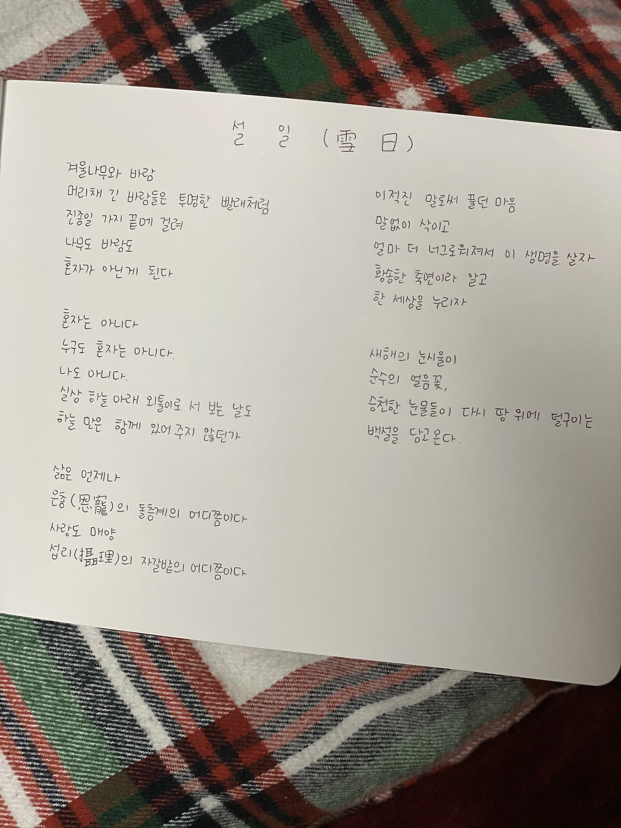 김남조 시인의 시를 적어보았다. 코가 시린 이 겨울에 왠지 마음 한구석이 따뜻해졌다.