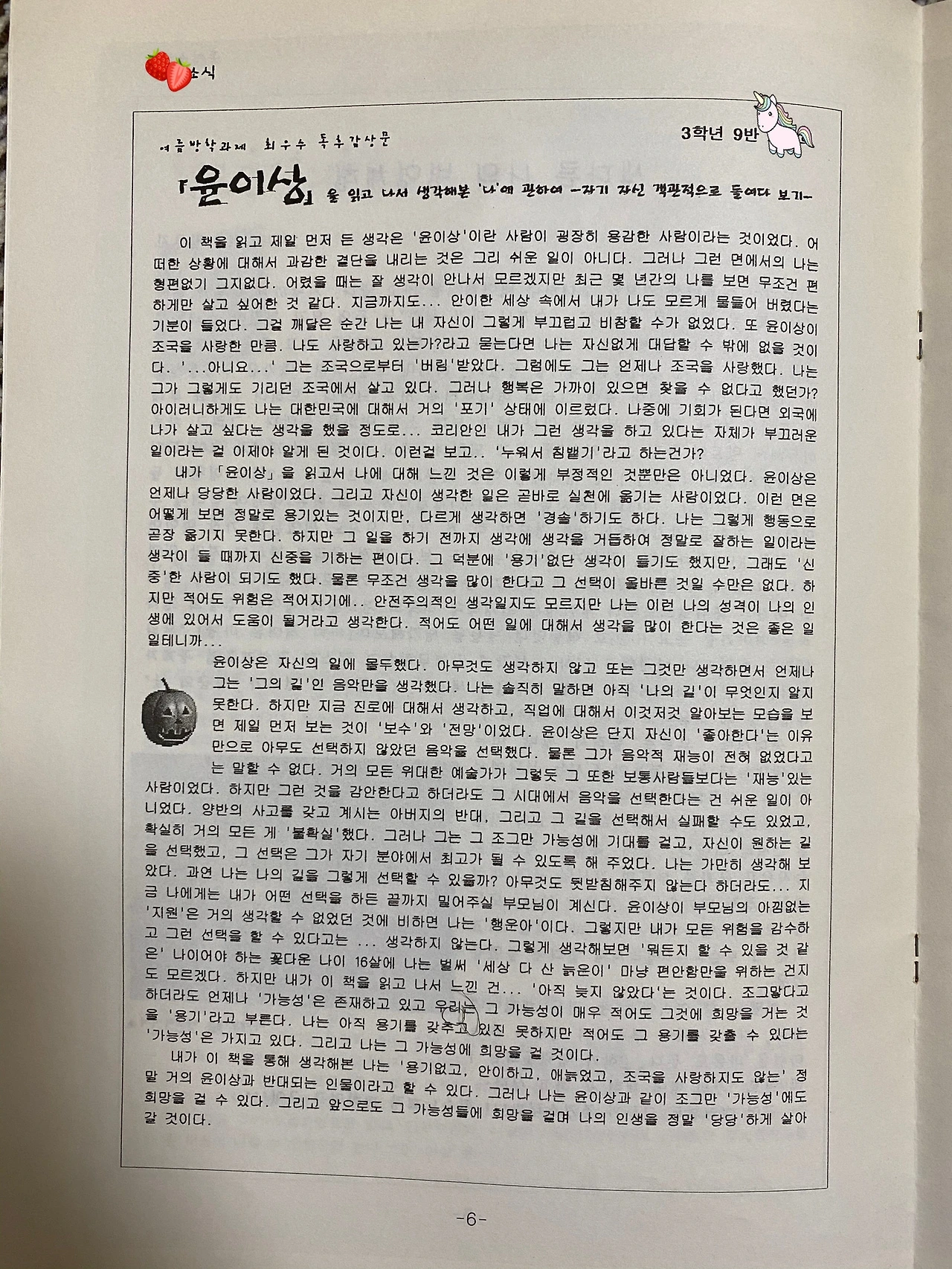 누군가 그랬던가? 책은 또 다른 세계로 통하는 문이라고. 그 얘기는 정말 사실인 것 같다. 진로를 결정해야 하는 중요한 시기에 조금 더 편안한 삶을 찾으려고 했던, 현실에 물들어 버렸던 내가, 윤이상이라는 사람의 삶을 통해서 그런 삶이 더욱 아름답다는 걸 깨닫고 진정한 삶의 가치에 대해서 생각해 볼 수 있게 되었기 때문이다. 돈이 많은 사람, 지식이 뛰어난 사람, 권력이 있는 사람들보다 아름다운 사람이 더욱 훌륭하다는 것, 그리고 그것이 인생의 참맛이라는 것을 나는 알게 되었다. 그리고 나는 이제 앞으로 나아갈 것이다. 가만히 있어서 흐르는 세월이 아니라, 그저 좇아가는 시간이 아니라, 시간이 나의 움직임에 따라오도록 하기 위해서, 그렇게 시련을 굴복시키는 사람이 되기 위해서, 그렇게 인생이라는 하나의 큰 산에 도전하는 아름다운 사람이 되기 위해서.