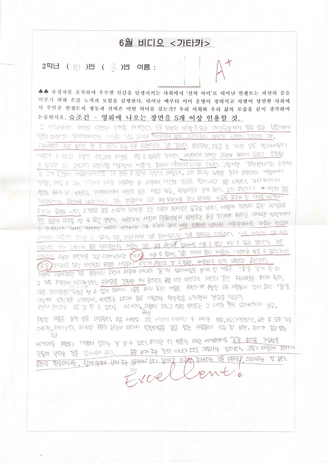 아래 글은 필자가 중학교 2학년 국어시간에 영화 <가타카>를 보고 논술 문제를 풀었던 결과물이다. 매월 명화를 골라 보여주고 논술을 내주신 선생님의 열정에 늦게나마 감사드리며, 신의 아이(자연 임신)로 태어나 유전적으로는 열성이었으나 꿈에 대해서는 누구보다 열심이었던 주인공에 대해 중학생의 시선으로 풀어낸 글을 함께 감상해보자. (스포일러 주의)