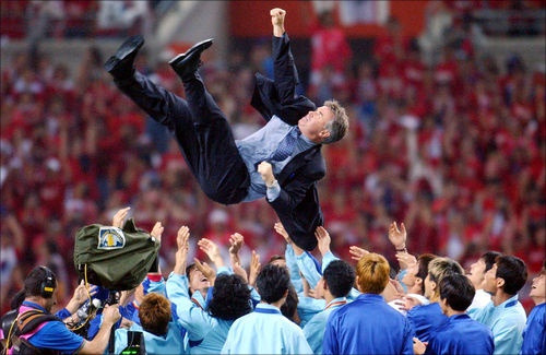 그러나 갑자기 국가대표 감독으로 등장해서 프랑스와 친선경기를 하며 5:0의 쓰라린 패배를 맛볼 때까지만 해도, 한국인들은 그의 실력을 의심했고, 당시 최고의 골키퍼로 이름을 날렸던 김병지 선수 대신 신인을 수문장으로 세운다는 소식을 듣고 경악을 금치 못했다. 그러나 의심도 잠시. 16강 전에서 연장전 끝에 단비와 같은 역전 골로 승리했을 때, 박지성 선수가 포르투갈전에서 그의 품에 달려가 안겼을 때, 그 모든 의심은 지워졌고 그의 놀라운 코칭과 감독에 대한 칭찬이 넘치다 못해 명예 한국인으로 추대되기도 했다.