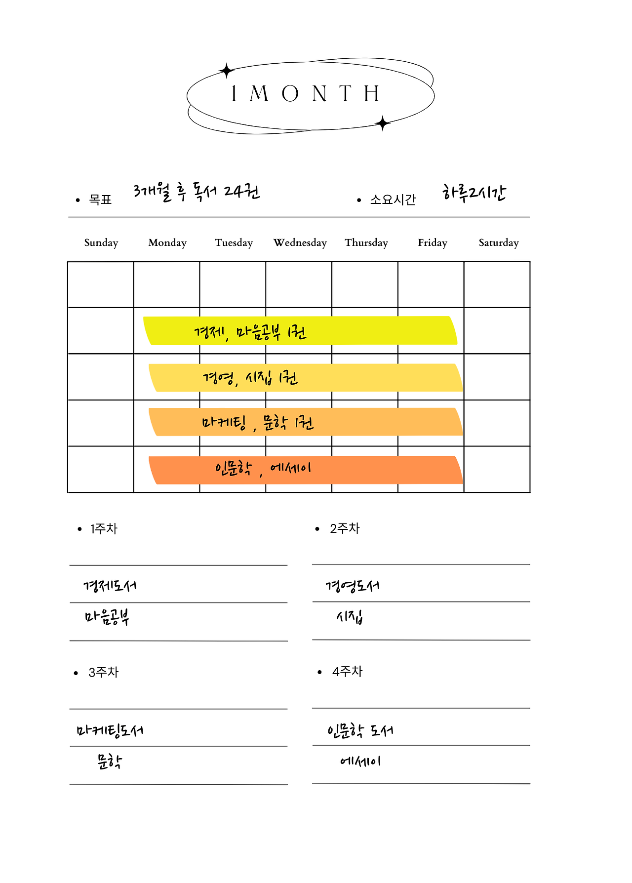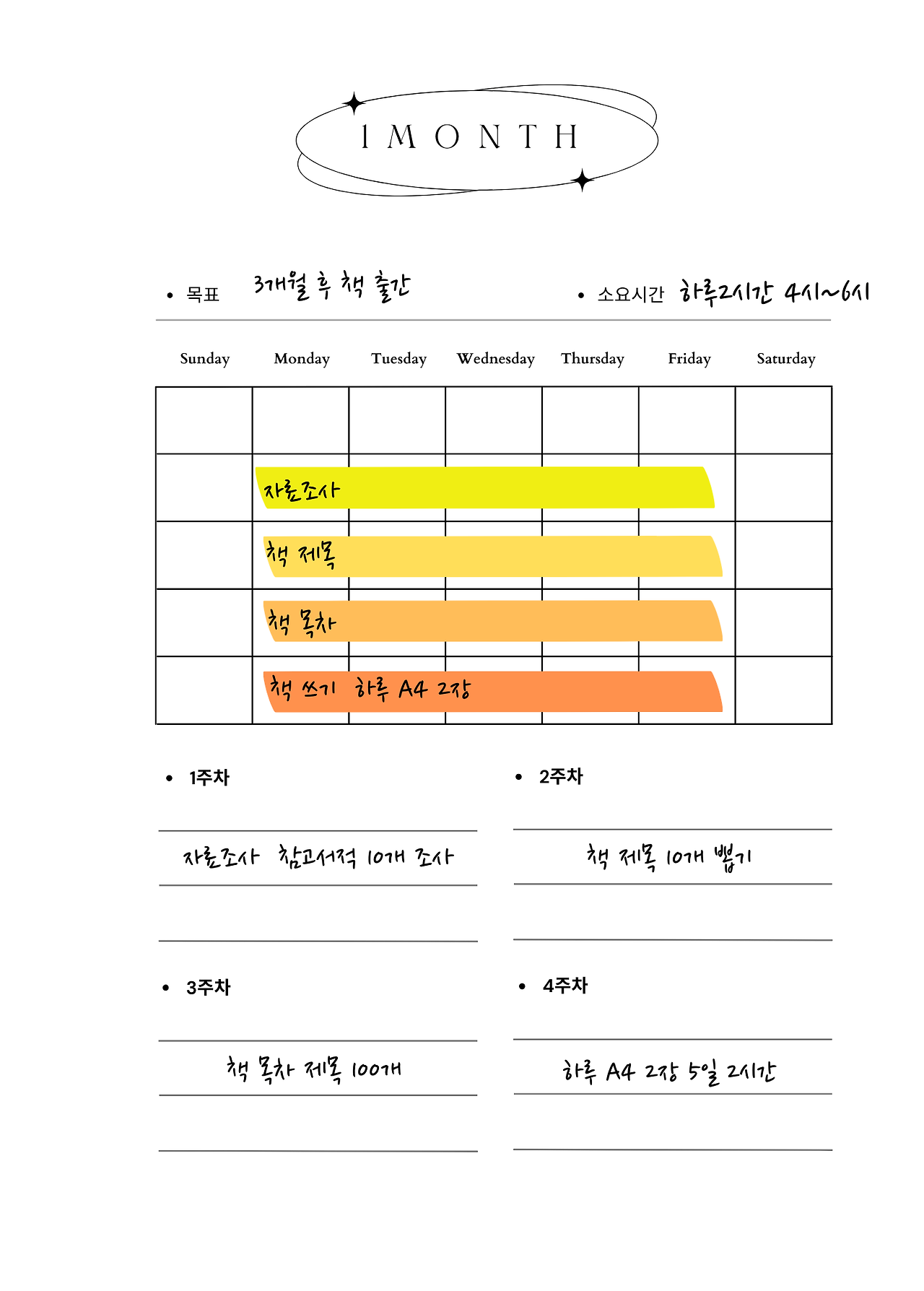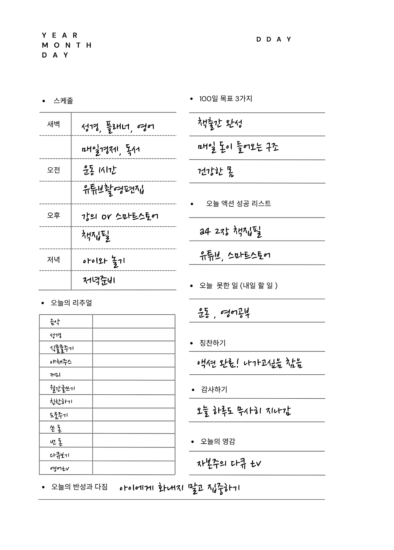사실,어떤 일이든 100일을 목표를 향해 몰입한다는 것이 쉬운 일이 아니라는 것을 느낄 것이다. 작심 3일이라는 말이 있듯이 진정 가슴에서 나온 목표가 아니라면 3일을 지속하기도 어렵기 때문이다. 어떤 목표를 정하든 이게 맞나? 아닌가? 의심하지 말고 100일을 성실하게 해볼 수 있다면 어떤 일이든 성공할 수 있다고 생각한다. 100일이 길게 느껴진다면 한 달 단위로 내 인생을 상상하고 계획하고 실행하고 점검하는 것은 누구나 가능한 일이다. 나는 육아를 하고 있어서 주말은 아이와 시간을 모두 보내고 주 5일, 20일은 철저하게 시간을 계획하고 관리한다.