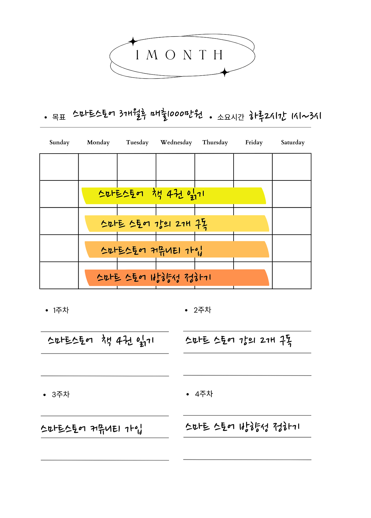 한 달에 4개의 상품이 업로드 될 것이고 한 달 뒤에 매출 달성이 가능한지 테스트해보고 다음 달에 보완해서 다시 4개의 상품을 올려본다. 100일 후에 어떠한 변화도 일어나지 않거나 생각했던 매출이 일어나지 않는다면 다시 처음으로 돌아가 스마트가게 강의를 듣거나 공부하는 시간을 가지고 다시 재도전한다.