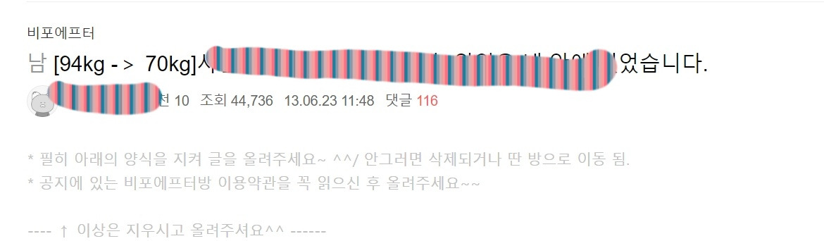 + 오랜만에 예전에 다이어트 성공 일지로 많은 분들께 칭찬과 격려를 받았던 글을 다시 읽어봤다. 너무 오글거리고 몸 둘 바를 모르겠지만 첫 다이어트 때의 초심이 떠올라 굉장히 기분이 묘했다. 뭔가 영화관에서 감동적인 명작 영화를 감상했을 때의 그런 느낌?... 더 열심히 해야겠다.