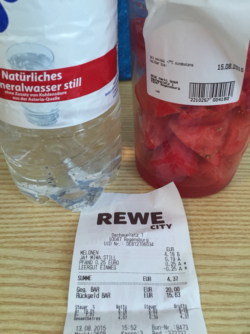 2. 다행히 구시가에서 숙소로 가는 길목에 꽤 큰 규모의 REWE가 있었다. 신선식품을 취급하는 곳이기 때문에 눈물이 날 정도로 시원하게 에어컨이 돌아가는 매장 안. 맘 같아서는 세월아 네월아 있고 싶었지만 배도 고프고 다리도 아팠기에 필요한 것만 사서 숙소로. 너무 더워 입맛이 없던터라 먹기 편하게 포장된 수박이 반갑기만 했다. 사진이 중간에 짤려서 사이즈가 가늠이 잘 안될텐데 스타벅스의 벤티 사이즈 크기의 컵에 아주 맛난 수박이 꼭꼭 들어차 있었음! 지겹게 말하지만 독일 장바구니 물가는 우리나라보다 저렴하고 그 중에 과일은 말도 안되게 저렴한 편이다. 한국에서는 너무 비싸서 혹은 혼자서 먹기 부담스러운 크기로만 팔아서 살 엄두도 못 냈던 수박, 수박 먹기 딱 좋은 날씨가 이어진 독일에서 꽤 자주 먹었다. 뭐... 에어컨 좀 없으면 어때~