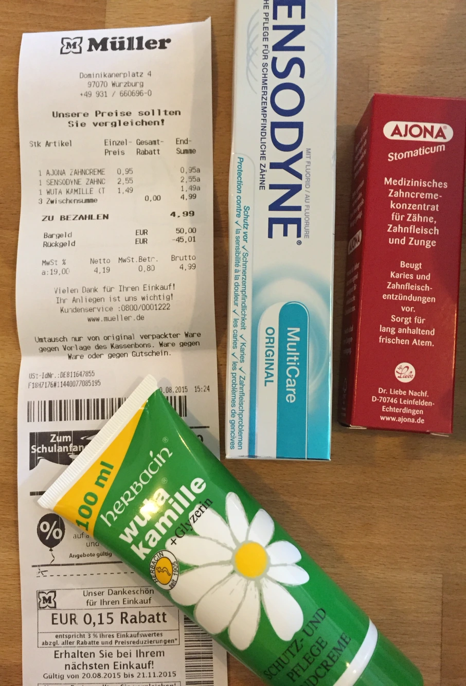 4. 영수증을 자세히 보면 다음번 구매 시 0.15유로를 할인해주는 쿠폰이 붙어있다. 그 자리에서 바로 사용할까 하다가 할인해준다고 계획에 없는 물건 구매하는 것은 할인 받는 것이 아닌 오히려 낭비라고 생각했기에 우선 곱게 접어 우선 지갑에 넣어뒀다. 다음 번에 뮐러에 가게 되면 사용하기 위해서. 만약 발행한 지점에서만 사용 가능 한거라면 어쩔수 없지만... 밑져야 본전 아니겠어? 결국 내가 손해보는 건 없으니까.
