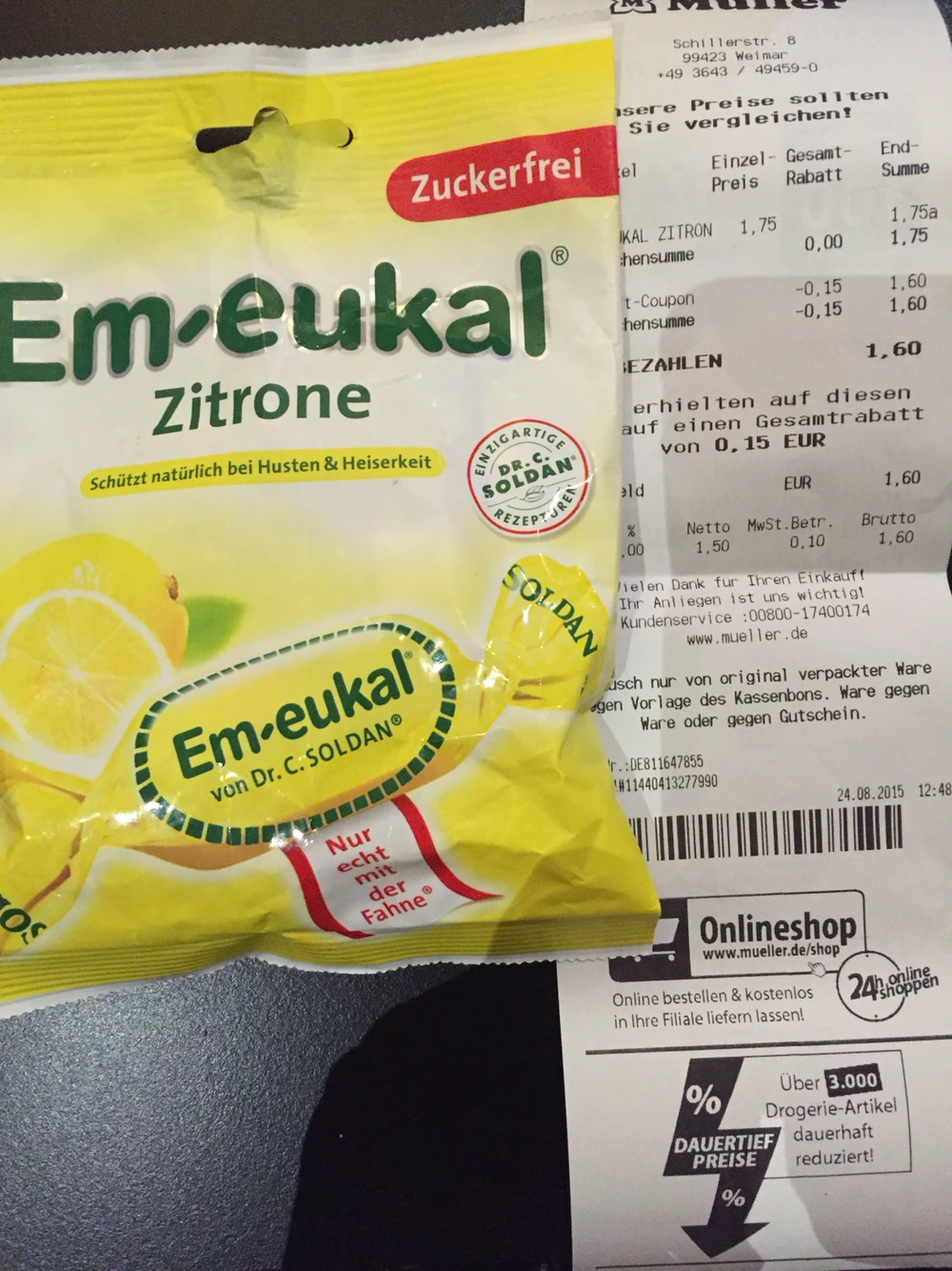 5. 그리하여 다음 도시인 바이마르로 이동. 으슬으슬 감기 기운이 오길래 일명 '감기약 사탕'을 구입해보기로 했다. 뮐러 고고. 안되면 말지 하는 심정으로 쿠폰을 내밀었는데 웬걸! 사용 가능. 결국 깨알같이 쿠폰까지 사용했다 ㅋㅋㅋ