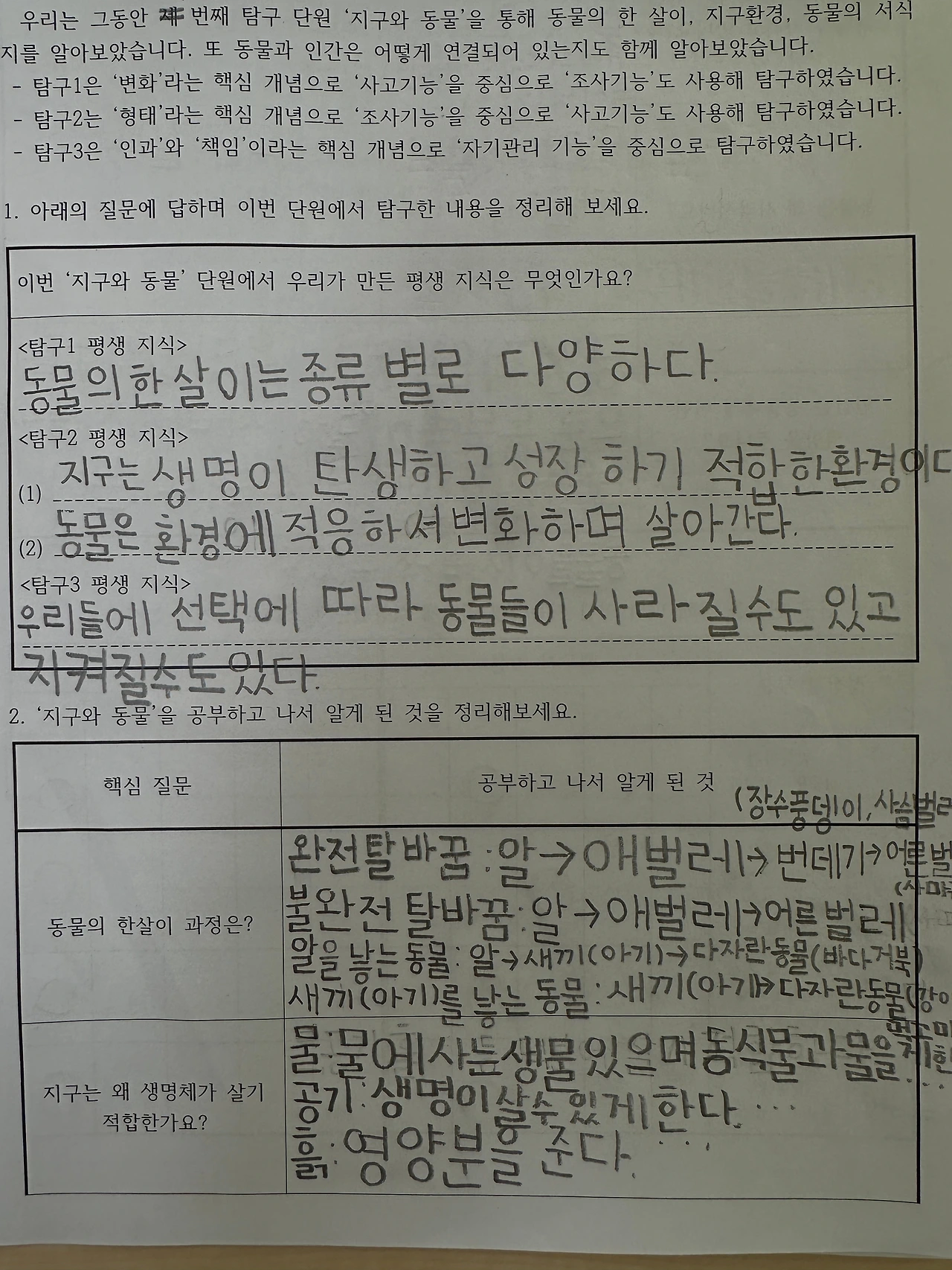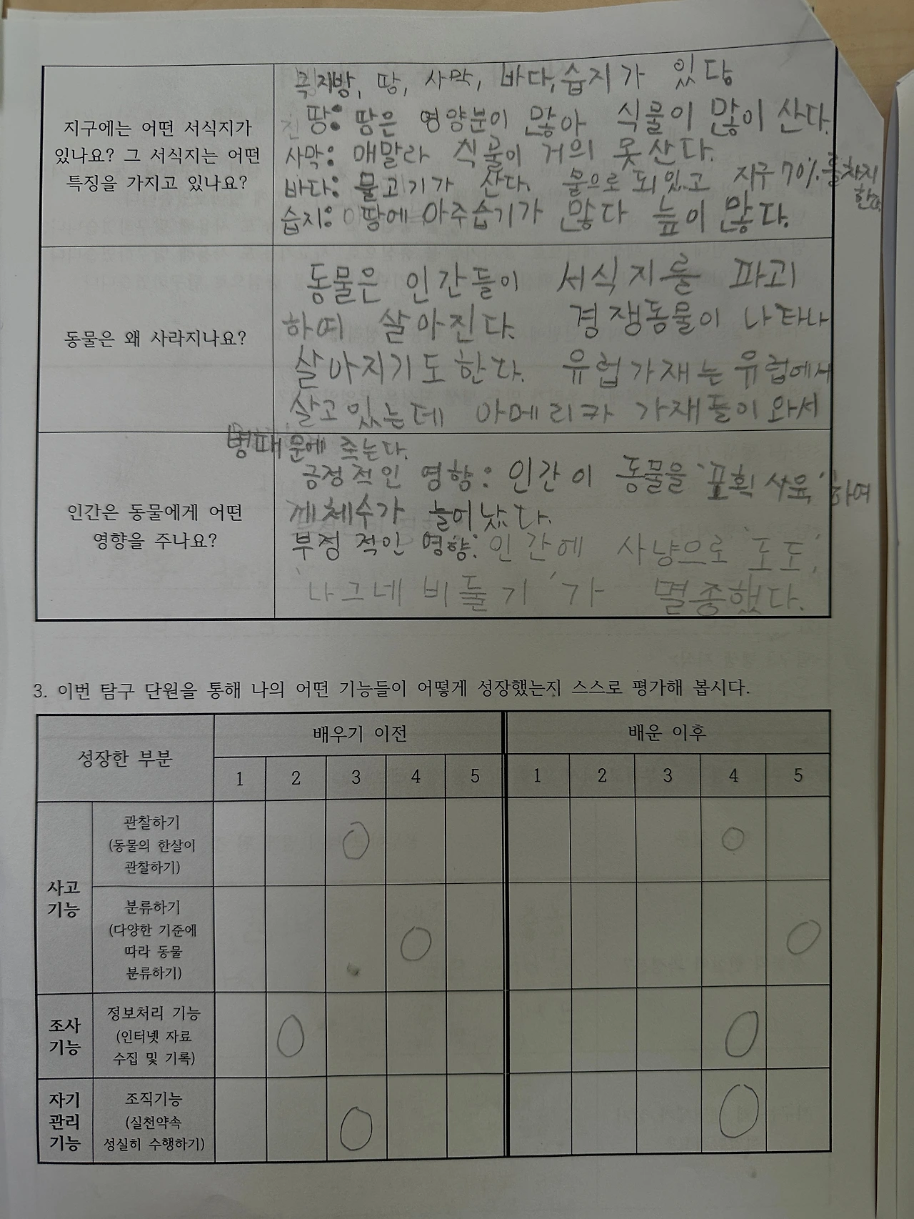 그리고 이어서 이번 단원을 성찰하는 시간을 가졌습니다. 전체 내용을 돌아보고 자신의 활동을 평가하는 시간을 가졌습니다.
