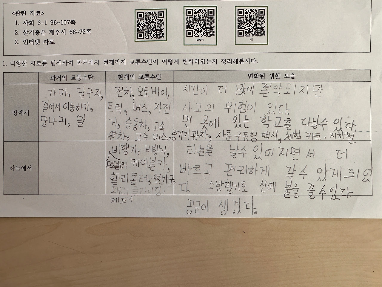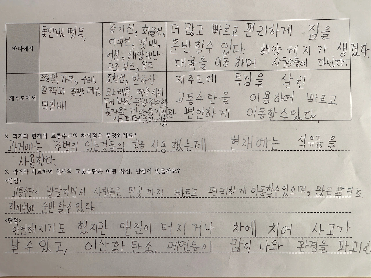 달라진 생활모습에서 그냥 정말 자신이 경험하는 달라진 생활 모습을 유추 할 수 있어야 하는데 아이들은 과거를 경험해 보지 않아서 그런지 상당히 어려워했습니다.