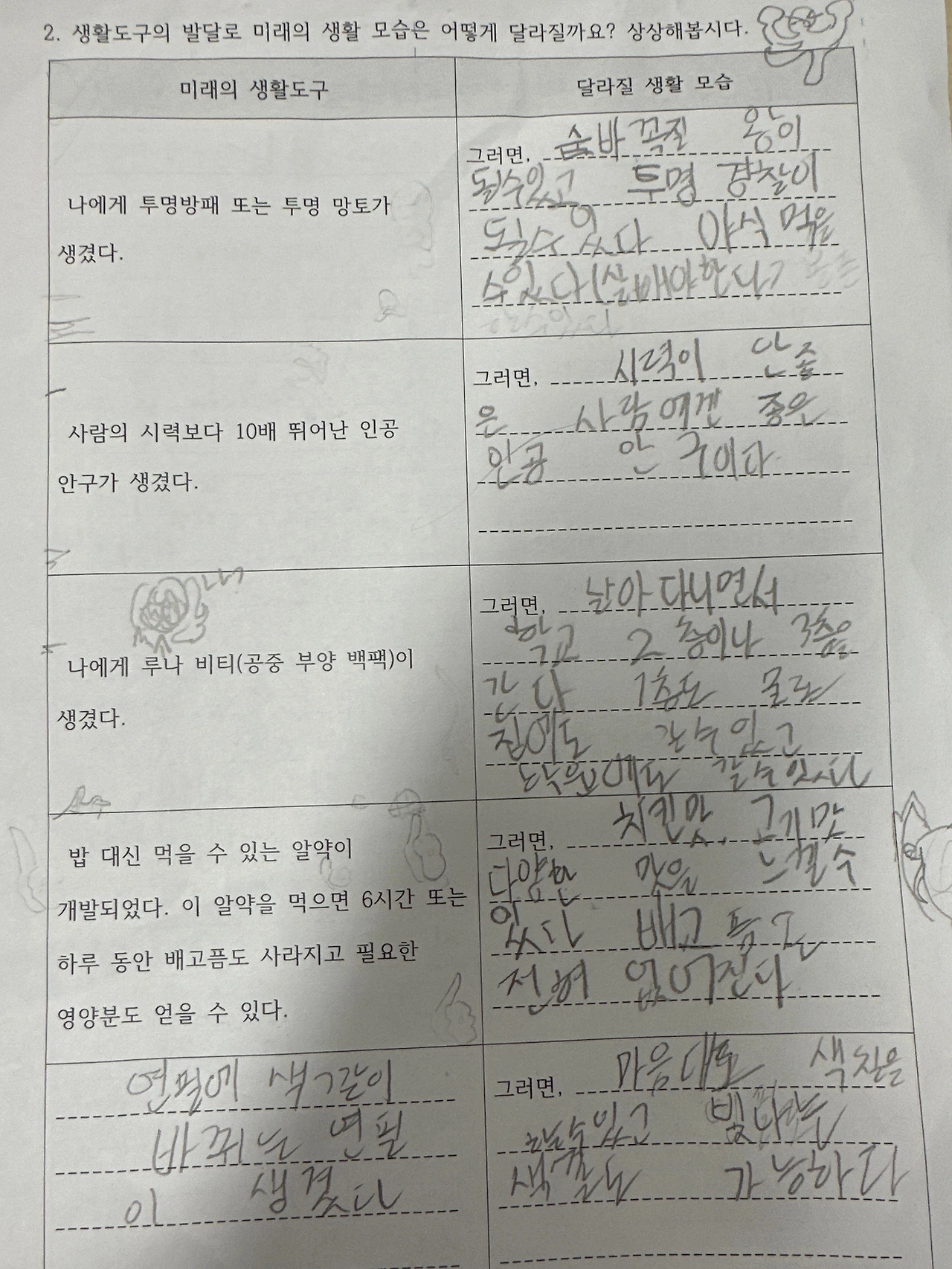 오늘도 지난 시간에 이어 탐구3 "미래로" 탐구를 이어갔습니다. 오늘은 미래의 생활도구에 대해서 함께 상상해 봤습니다. 그리고 어제와 마찬가지로 함께 의사소통하는 시간도 가졌습니다.