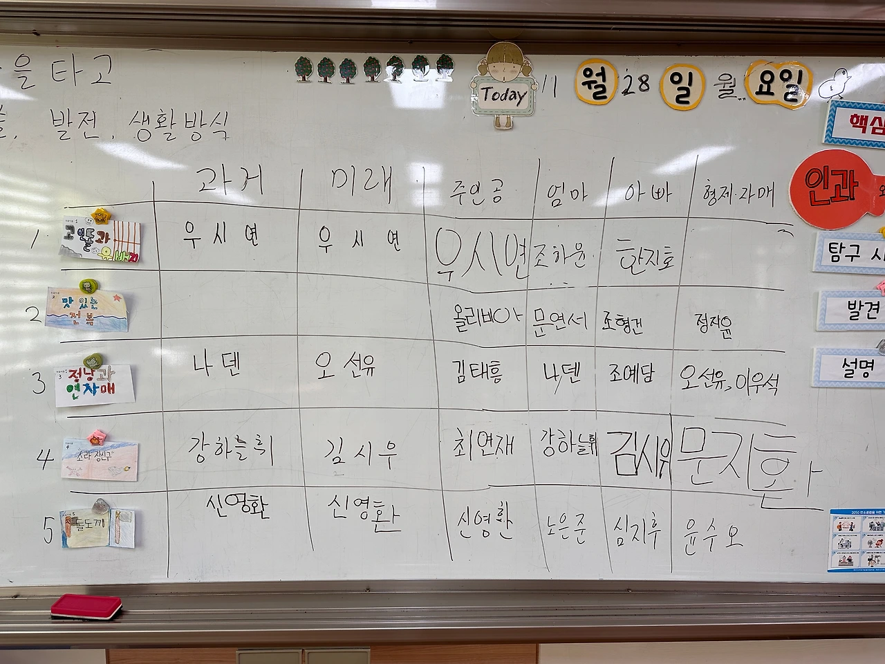 이번 단원 설명하기 단계에서 아이들은 과거, 현재, 미래 이야기를 담은 "00 이의 시간여행" 시나리오를 쓰고 있습니다. 오늘은 모둠별로 작성한 시나리오중에 실제 연기를 펼칠 시나리오를 선정하고, 역할을 정하는 시간을 가졌습니다. 결석생이 있는 2모둠을 제외하고 다른 모둠은 시나리오와 역할을 모두 정했습니다.