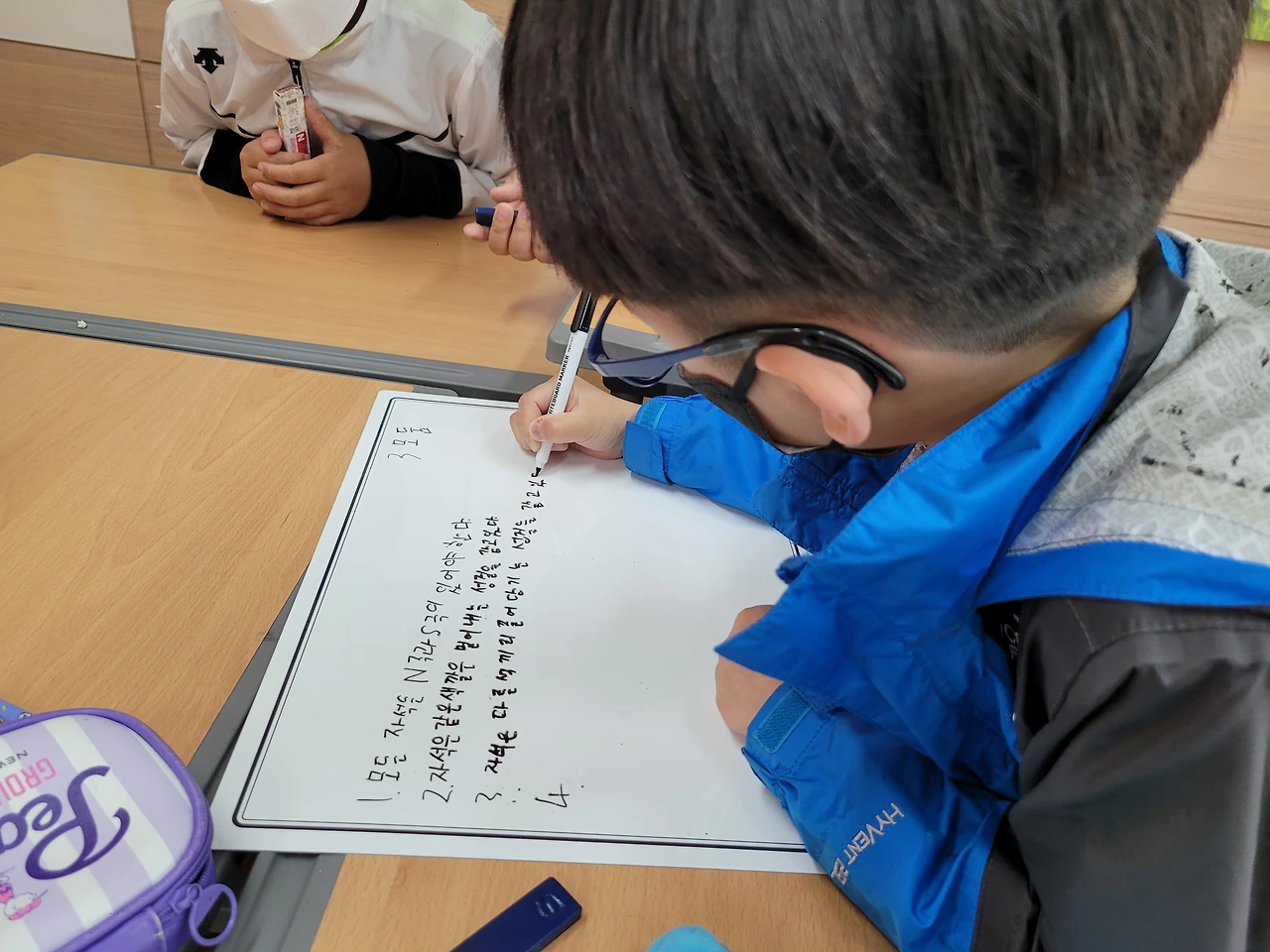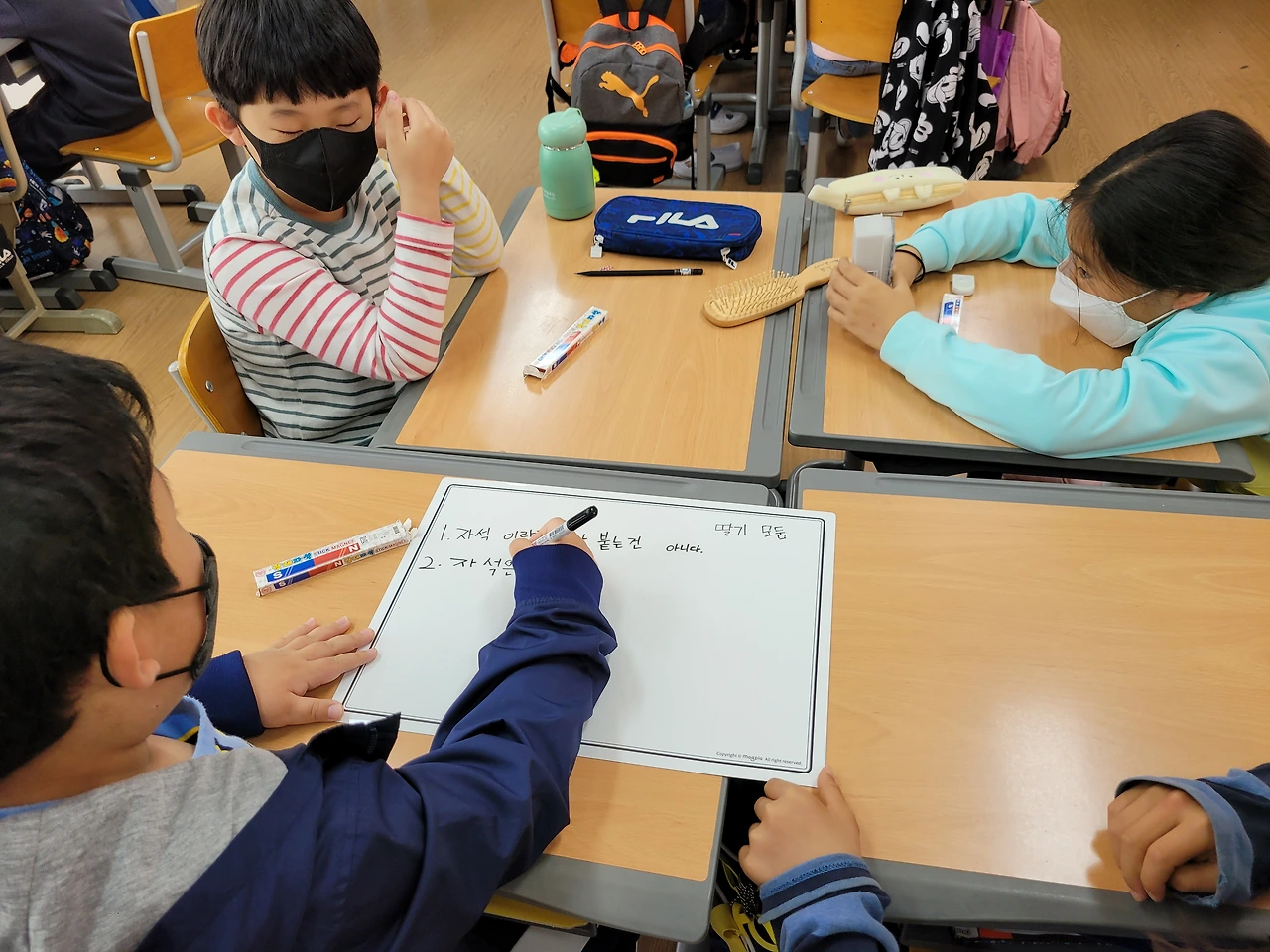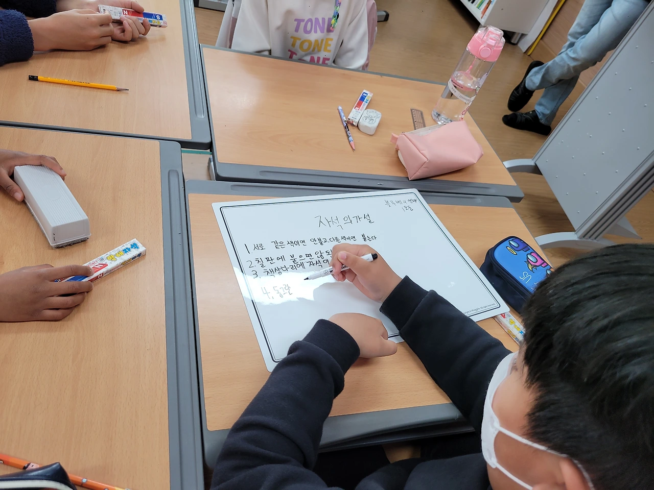 그리고는 아이들에게 모둠별로 진짜 자석의 조건이 무엇인지 가설을 세워보도록 했습니다. 앞으로 이어질 실험을 위한 가설을 만드는 것입니다.