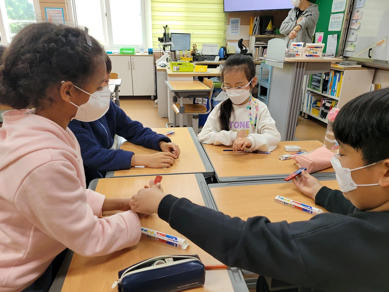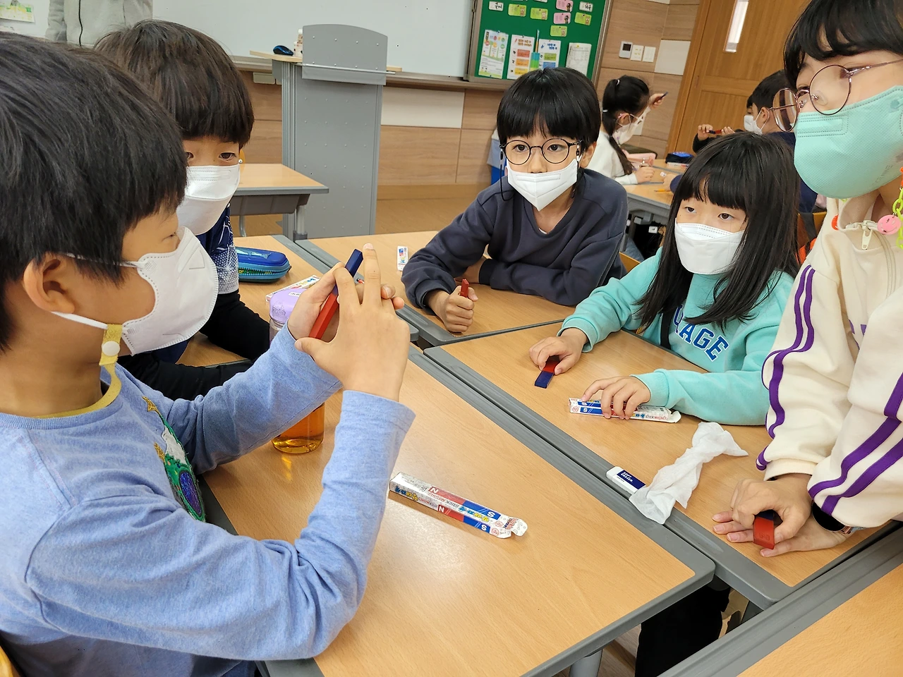 그리고 모둠 친구들끼리 자석을 붙여 보면서 진짜 자석인지 가짜 자석인지 알아봅니다.